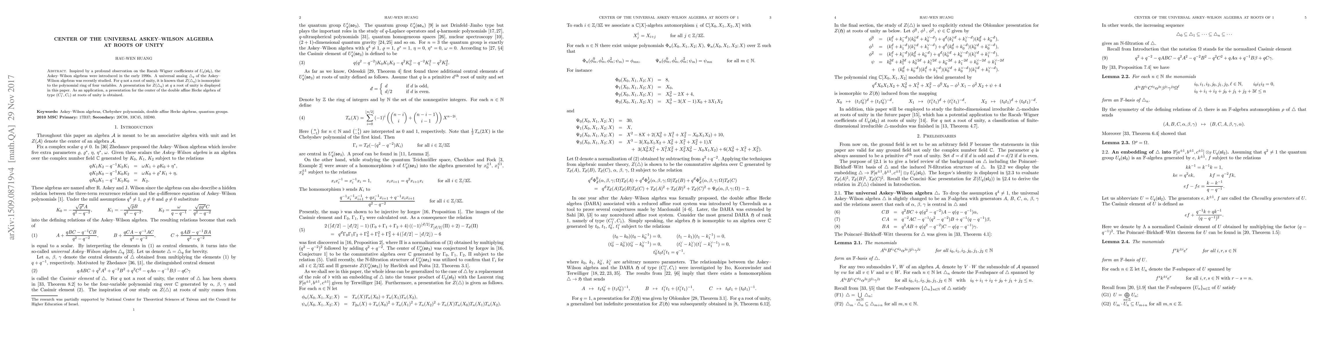 Inspired by a profound observation on the Racah--Wigner coefficients of $U_q(\mathfrak{sl}_2)$, the Askey--Wilson algebras were introduced in the early 1990s. A universal analog $\triangle_q$ of the Askey--Wilson algebras was recently studied. For $q$ not a root of unity, it is known that $Z(\triangle_q)$ is isomorphic to the polynomial ring of four variables. A presentation for $Z(\triangle_q)$ at $q$ a root of unity is displayed in this paper. As an application, a presentation for the center of the double affine Hecke algebra of type $(C_1^\vee,C_1)$ at roots of unity is obtained.