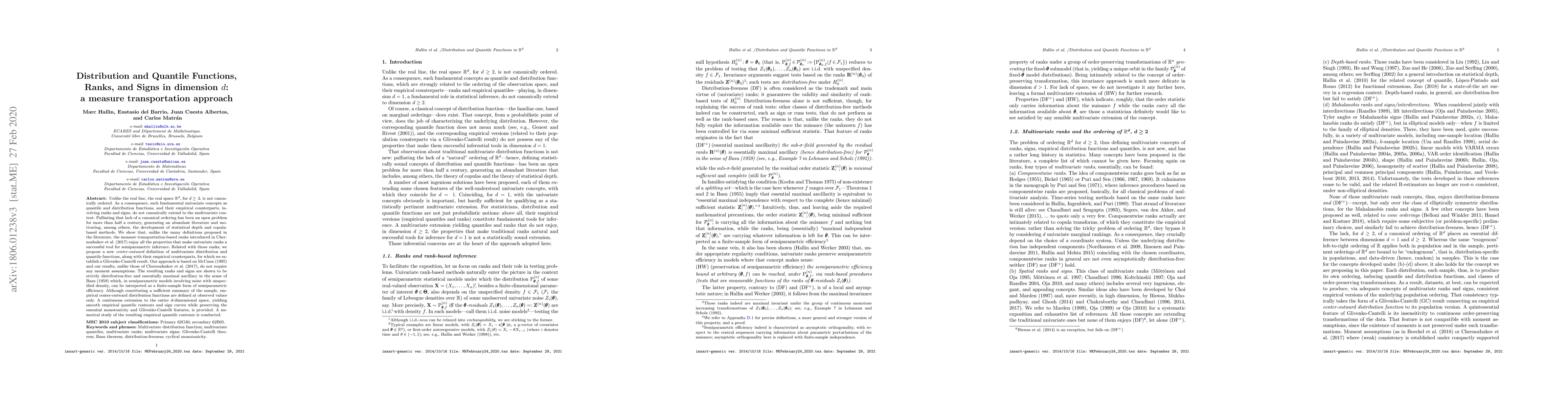 Univariate concepts as quantile and distribution functions involving ranks and signs, do not canonically extend to $\mathbb{R}^d, d\geq 2$. Palliating that has generated an abundant literature. Chapter 1 shows that, unlike the many definitions that have been proposed so far, the measure transportation-based ones introduced in Chernozhukov et al. (2017) enjoy all the properties that make univariate quantiles and ranks successful tools for semiparametric statistical inference. We therefore propose a new center-outward definition of multivariate distribution and quantile functions, along with their empirical counterparts, for which we obtain a Glivenko-Cantelli result. Our approach is geometric and, contrary to the Monge-Kantorovich one in Chernozhukov et al. (2017), does not require any moment assumptions. The resulting ranks and signs are strictly distribution-free, and maximal invariant under the action of a data-driven class of (order-preserving) transformations generating the family of absolutely continuous distributions; that property is the theoretical foundation of the semiparametric efficiency preservation property of ranks. The corresponding quantiles are equivariant under the same transformations. The empirical proposed distribution functions are defined at observed values only. A continuous extension to the entire $\mathbb{R}^d$, yielding continuous empirical quantile contours while preserving the monotonicity and Glivenko-Cantelli features is desirable. Such extension requires solving a nontrivial problem of smooth interpolation under cyclical monotonicity constraints. A complete solution of that problem is given in Chapter 2; we show that the resulting distribution and quantile functions are Lipschitz, and provide a sharp lower bound for the Lipschitz constants. A numerical study of empirical center-outward quantile contours and their consistency is conducted.