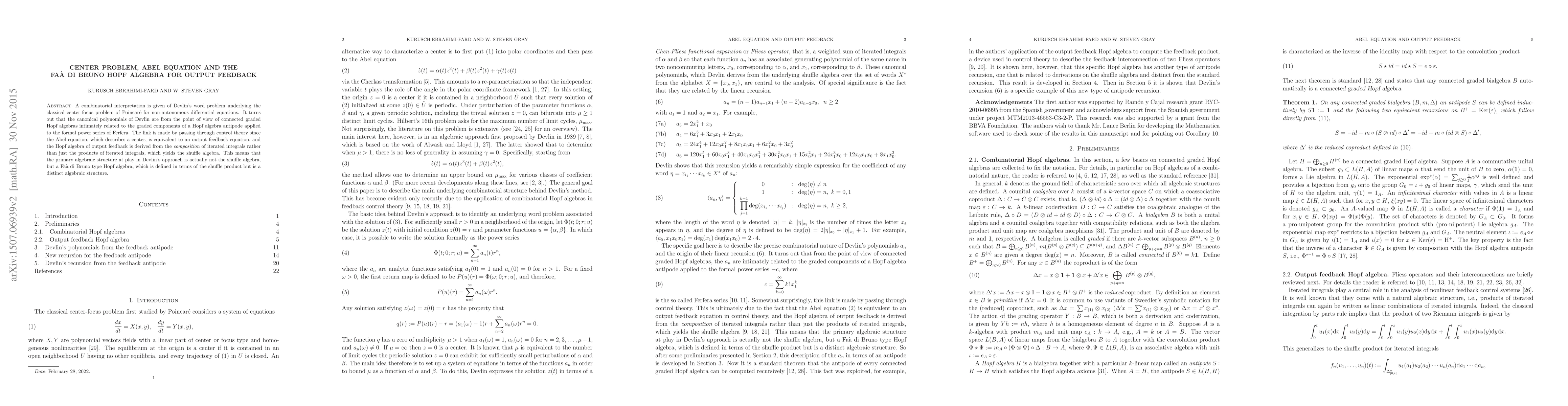 A combinatorial interpretation is given of Devlin's word problem underlying the classical center-focus problem of Poincare for non-autonomous differential equations. It turns out that the canonical polynomials of Devlin are from the point of view of connected graded Hopf algebras intimately related to the graded components of a Hopf algebra antipode applied to the formal power series of Ferfera. The link is made by passing through control theory since the Abel equation, which describes a center, is equivalent to an output feedback equation, and the Hopf algebra of output feedback is derived from the composition of iterated integrals rather than just the products of iterated integrals, which yields the shuffle algebra. This means that the primary algebraic structure at play in Devlin's approach is actually not the shuffle algebra, but a Faa di Bruno type Hopf algebra, which is defined in terms of the shuffle product but is a distinct algebraic structure.