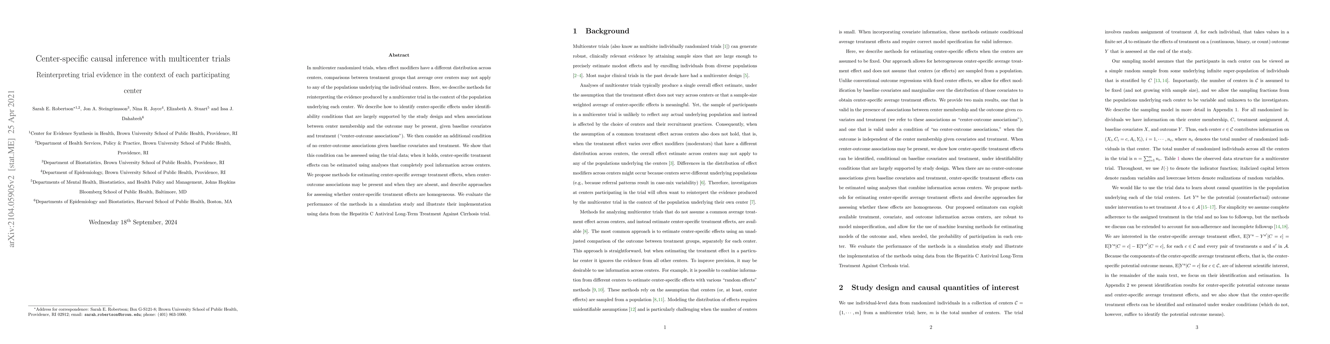In multicenter randomized trials, when effect modifiers have a different distribution across centers, comparisons between treatment groups that average over centers may not apply to any of the populations underlying the individual centers. Here, we describe methods for reinterpreting the evidence produced by a multicenter trial in the context of the population underlying each center. We describe how to identify center-specific effects under identifiability conditions that are largely supported by the study design and when associations between center membership and the outcome may be present, given baseline covariates and treatment ("center-outcome associations"). We then consider an additional condition of no center-outcome associations given baseline covariates and treatment. We show that this condition can be assessed using the trial data; when it holds, center-specific treatment effects can be estimated using analyses that completely pool information across centers. We propose methods for estimating center-specific average treatment effects, when center-outcome associations may be present and when they are absent, and describe approaches for assessing whether center-specific treatment effects are homogeneous. We evaluate the performance of the methods in a simulation study and illustrate their implementation using data from the Hepatitis C Antiviral Long-Term Treatment Against Cirrhosis trial.