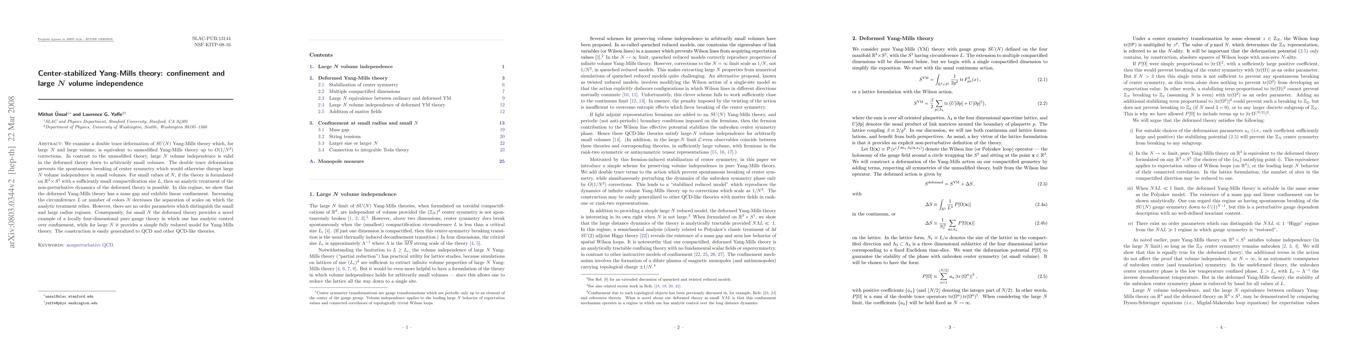 This research paper introduces a double trace deformation of SU(N) Yang-Mills theory that maintains large volume independence at small volumes, allowing for analytic control over confinement, a novel example of a locally four-dimensional pure gauge theory.