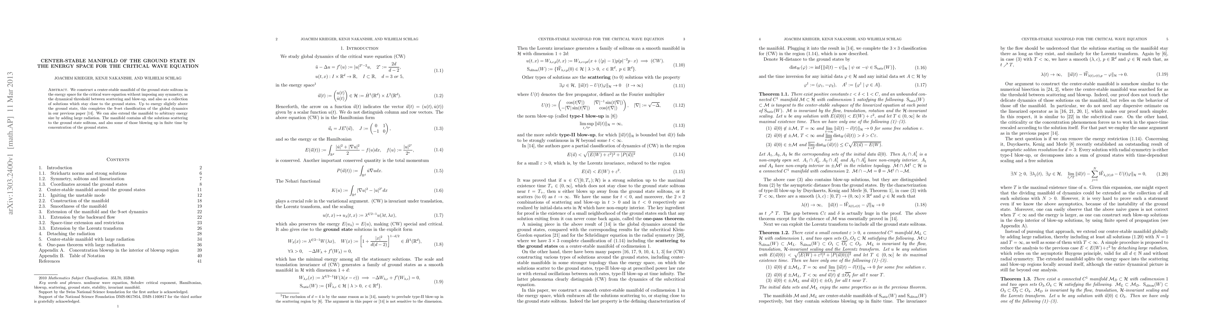This paper constructs a center-stable manifold for ground state solitons in the energy space of the critical wave equation, serving as a threshold between scattering and blow-up. It completes the 9-set classification of global dynamics and extends to larger energies with added radiation.