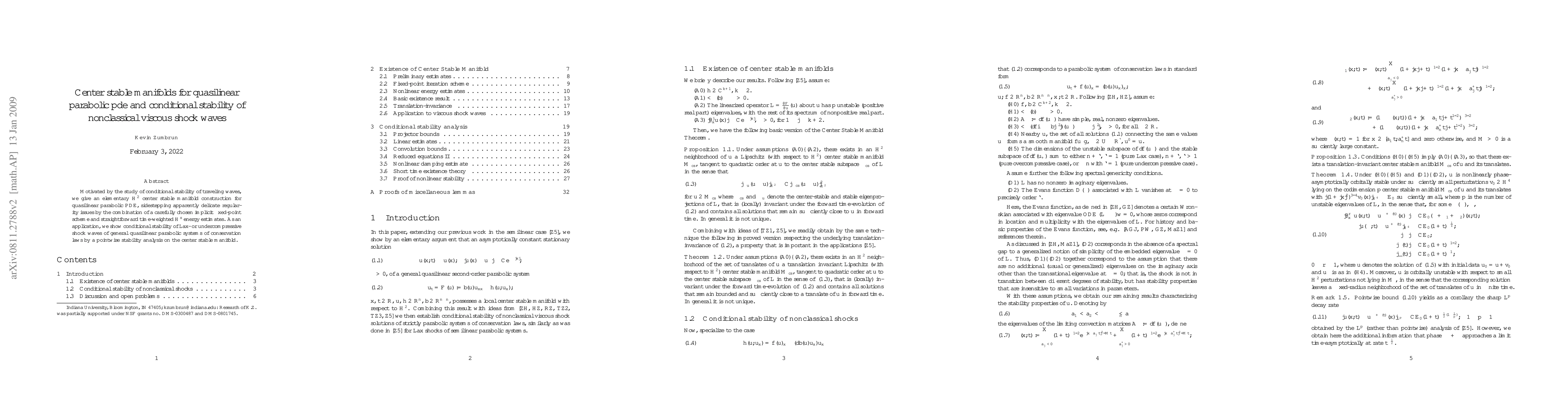 This paper constructs an $H^2$ center stable manifold for quasilinear parabolic PDEs to study the conditional stability of nonclassical viscous shock waves, using a fixed-point scheme and damping-type energy estimates. The methods generalize beyond traditional parabolic smoothing, demonstrating conditional stability for Lax- or undercompressive shock waves.