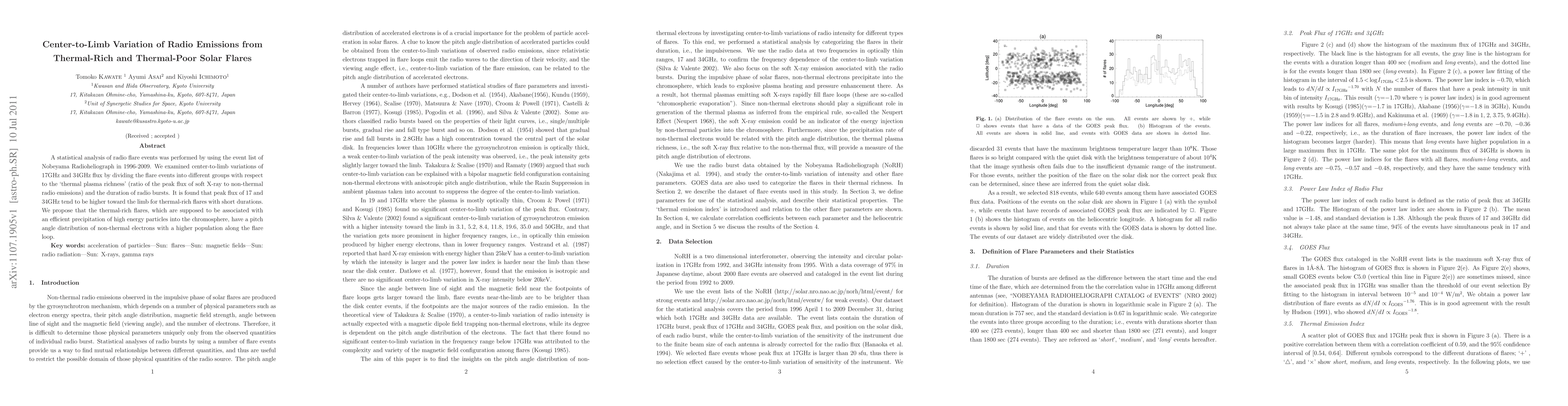 A statistical analysis of radio flare events was performed by using the event list of Nobeyama Radioheliograph in 1996-2009. We examined center-to-limb variations of 17GHz and 34GHz flux by dividing the flare events into different groups with respect to the 'thermal plasma richness' (ratio of the peak flux of soft X-ray to non-thermal radio emissions) and the duration of radio bursts. It is found that peak flux of 17 and 34GHz tend to be higher toward the limb for thermal-rich flares with short durations. We propose that the thermal-rich flares, which are supposed to be associated with an efficient precipitation of high energy particles into the chromosphere, have a pitch angle distribution of non-thermal electrons with a higher population along the flare loop.