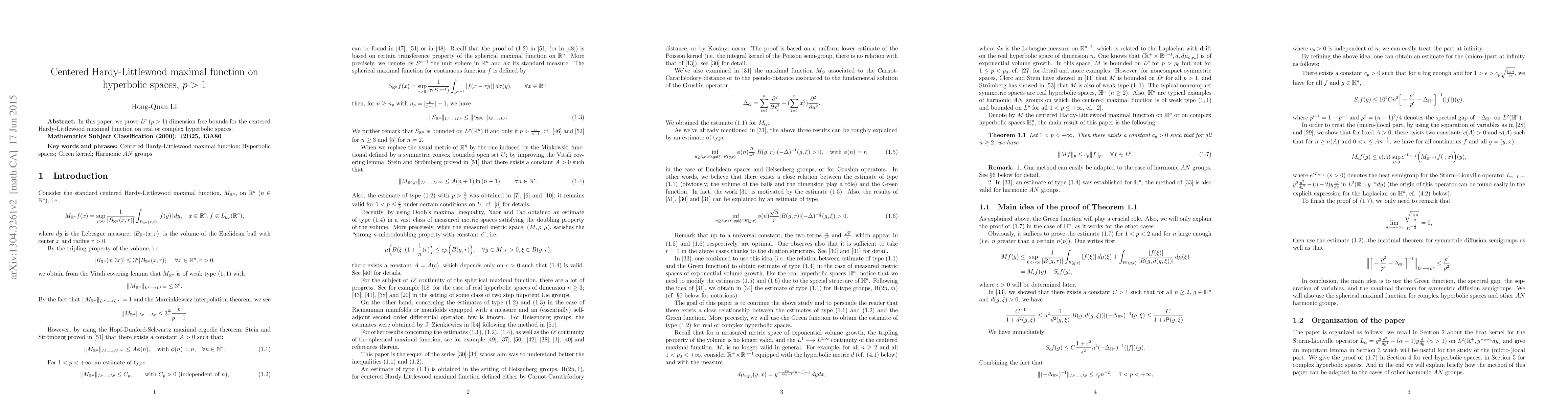 Summary: This paper establishes dimension-independent $L^p$ ($p > 1$) bounds for the centered Hardy-Littlewood maximal function on real or complex hyperbolic spaces, contributing to the understanding of maximal functions in non-Euclidean settings.