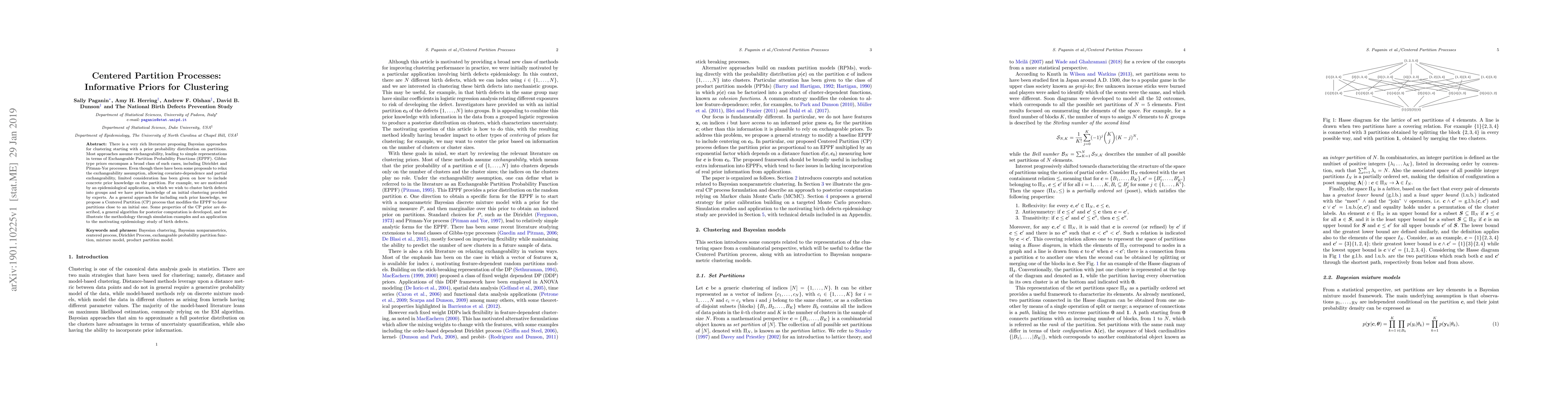 There is a very rich literature proposing Bayesian approaches for clustering starting with a prior probability distribution on partitions. Most approaches assume exchangeability, leading to simple representations in terms of Exchangeable Partition Probability Functions (EPPF). Gibbs-type priors encompass a broad class of such cases, including Dirichlet and Pitman-Yor processes. Even though there have been some proposals to relax the exchangeability assumption, allowing covariate-dependence and partial exchangeability, limited consideration has been given on how to include concrete prior knowledge on the partition. For example, we are motivated by an epidemiological application, in which we wish to cluster birth defects into groups and we have prior knowledge of an initial clustering provided by experts. As a general approach for including such prior knowledge, we propose a Centered Partition (CP) process that modifies the EPPF to favor partitions close to an initial one. Some properties of the CP prior are described, a general algorithm for posterior computation is developed, and we illustrate the methodology through simulation examples and an application to the motivating epidemiology study of birth defects.