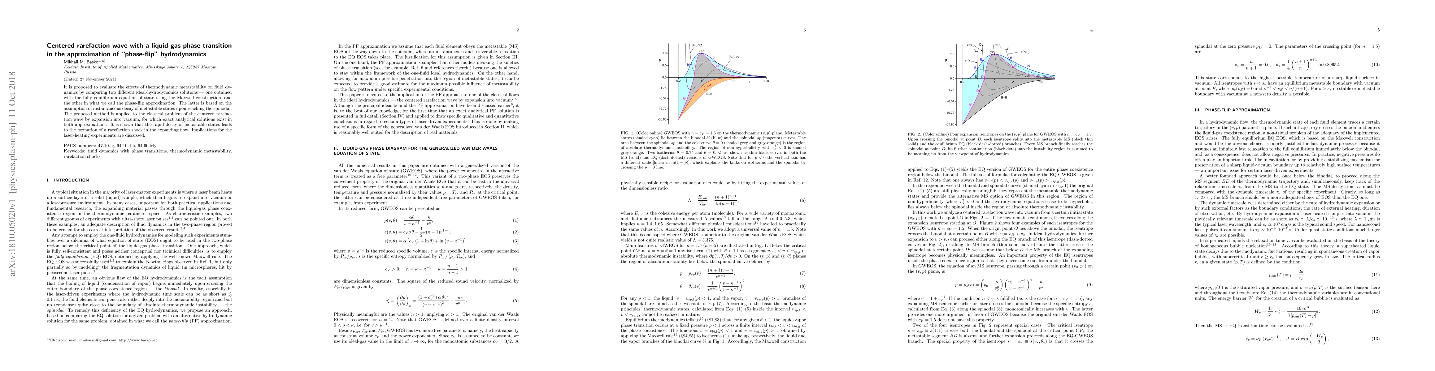 This research proposes comparing two hydrodynamic solutions to study metastability effects on fluid dynamics. Using a 'phase-flip' approximation, it shows that rapid decay of metastable states in a centered rarefaction wave leads to rarefaction shock formation, with implications for laser-heating experiments.