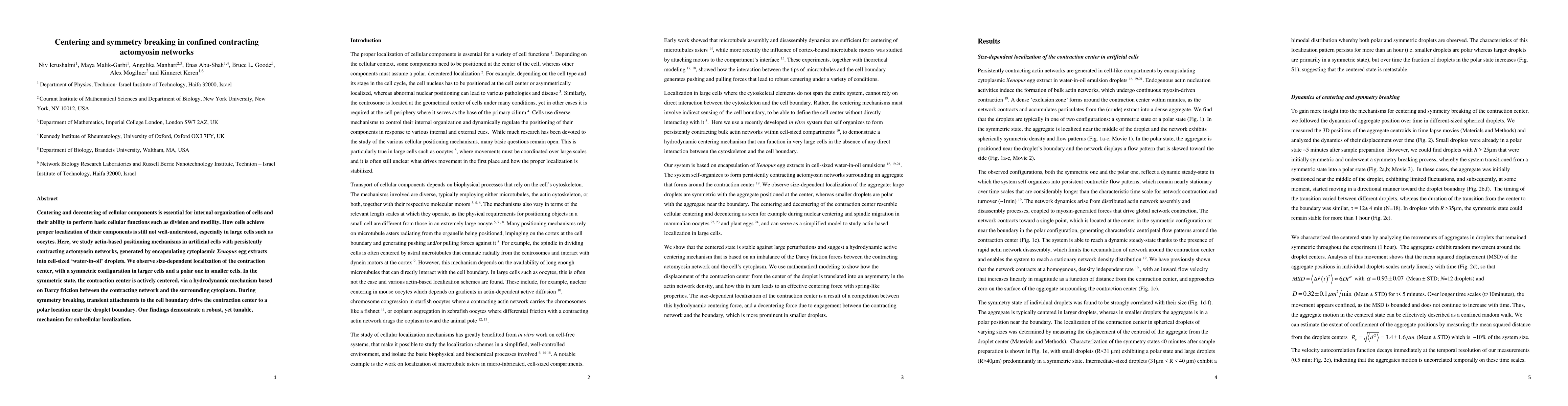 This study investigates the mechanisms of centering and symmetry breaking in actomyosin networks within artificial cells, revealing a size-dependent localization of the contraction center, with symmetric and polar configurations in larger and smaller cells, respectively. The research highlights a tunable mechanism for subcellular localization based on hydrodynamic interactions and transient boundary attachments.