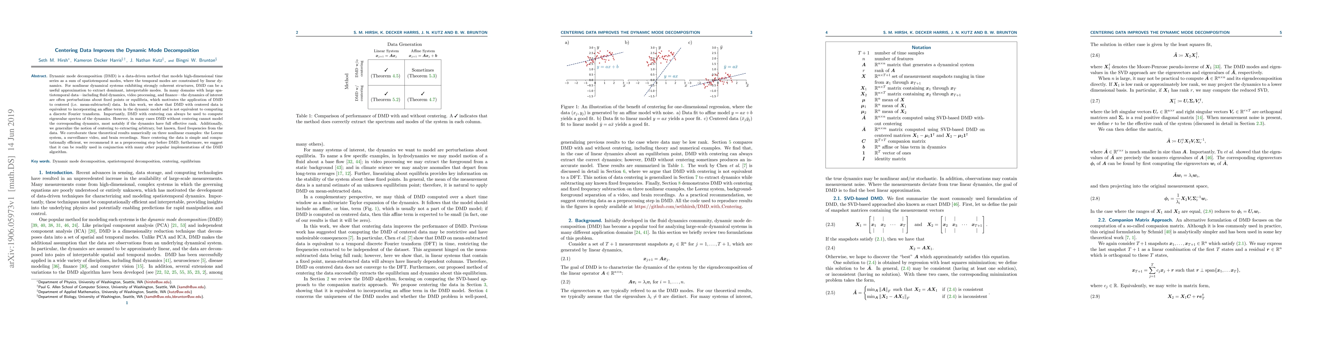 The paper proposes centering data as a preprocessing step for Dynamic Mode Decomposition (DMD), demonstrating its equivalence to incorporating an affine term in the dynamic model and its distinction from a Discrete Fourier Transform (DFT).