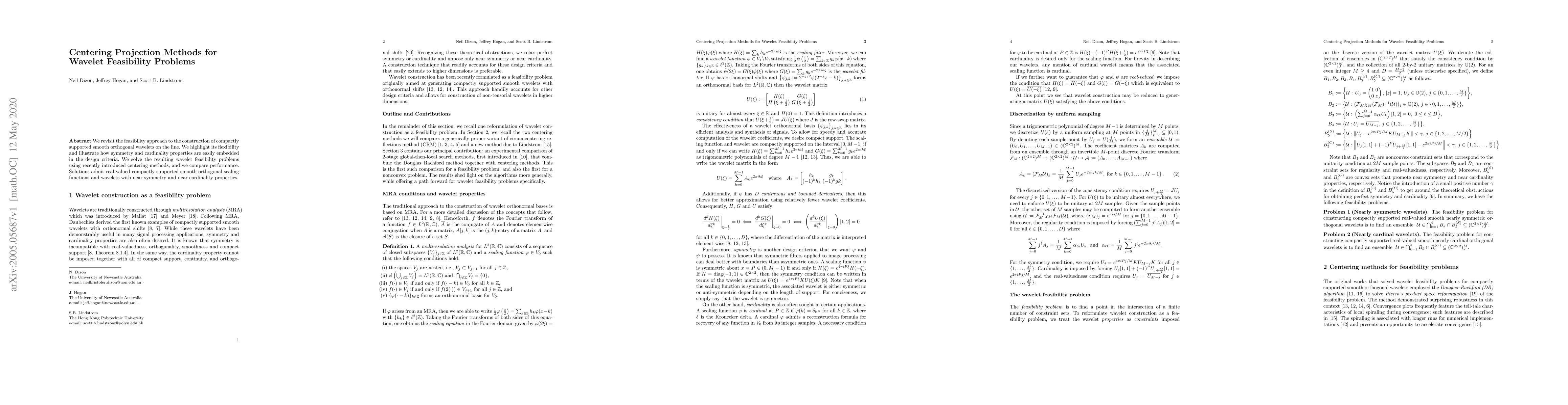 This paper explores the feasibility approach for constructing compactly supported smooth orthogonal wavelets, emphasizing the incorporation of symmetry and cardinality through centering projection methods. The proposed centering methods effectively solve the feasibility problems, yielding wavelets with near-symmetry and near-cardinality properties.