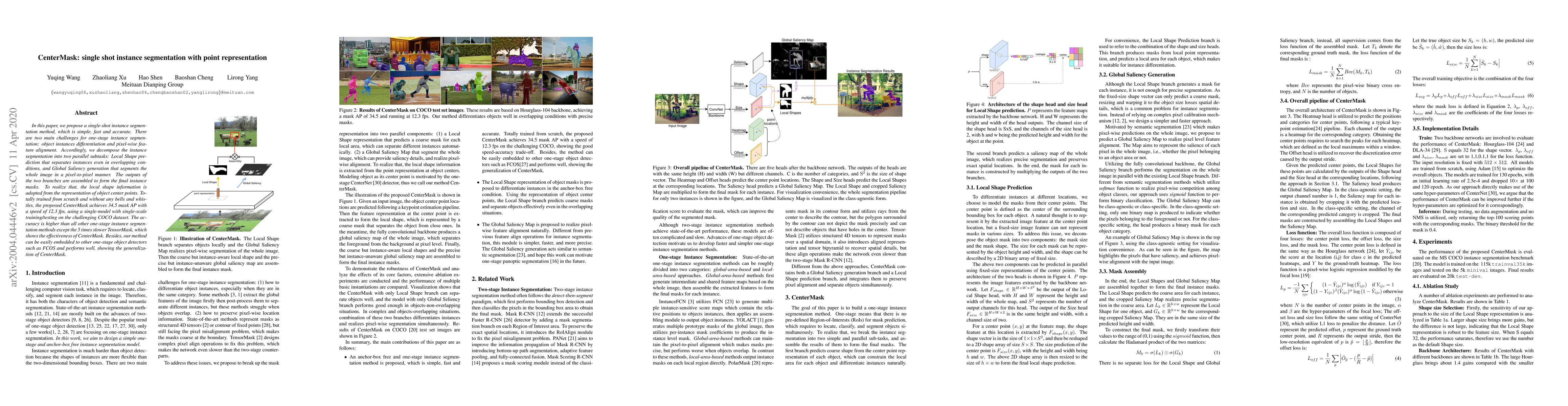 The CenterMask method proposes a simple, fast, and accurate single-shot instance segmentation approach by decomposing the task into local shape prediction and global saliency generation, achieving 34.5 mask AP at 12.3 fps on COCO, outperforming other one-stage methods except TensorMask. It can also be integrated with other detectors like FCOS.