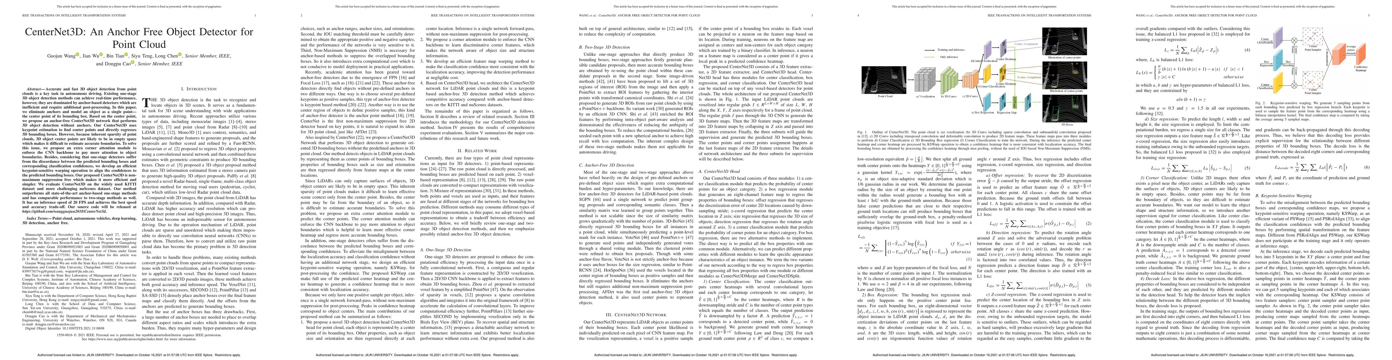 CenterNet3D is an anchor-free 3D object detector for point clouds that uses keypoint estimation to identify center points and directly regresses 3D bounding boxes, eliminating the need for anchors and post-processing. It incorporates a corner attention module to address sparsity issues and an efficient warping operation to align classification confidences, achieving superior speed and accuracy on KITTI and nuScenes datasets.