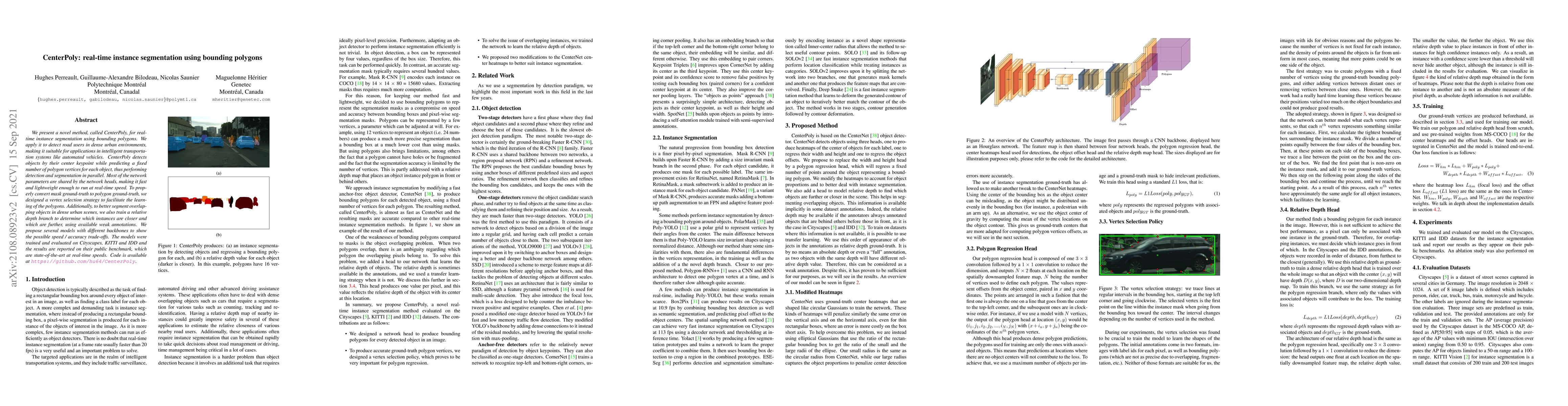 CenterPoly is a real-time instance segmentation method using bounding polygons, detecting road users in urban environments for intelligent transportation systems. It employs shared network parameters and a vertex selection strategy for efficient polygon ground-truth learning, achieving state-of-the-art results on Cityscapes, KITTI, and IDD benchmarks.
