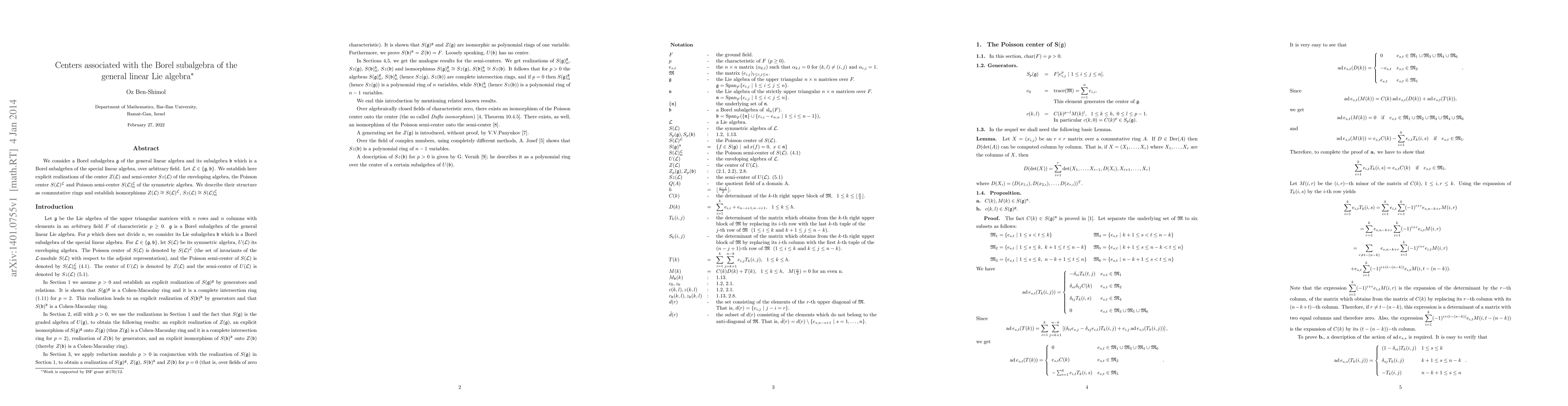 We consider a Borel subalgebra $\fg$ of the general linear algebra and its subalgebra $\BB$ which is a Borel subalgebra of the special linear algebra, over arbitrary field. Let $\cL\in\{\fg, \BB\}$. We establish here explicit realizations of the center $Z(\cL)$ and semi-center $Sz(\cL)$ of the enveloping algebra, the Poisson center $S(\cL)^{\cL}$ and Poisson semi-center $S(\cL)^{\cL}_{\si}$ of the symmetric algebra. We describe their structure as commutative rings and establish isomorphisms $Z(\cL)\cong S(\cL)^{\cL}$, $Sz(\cL)\cong S(\cL)^{\cL}_{\si}$