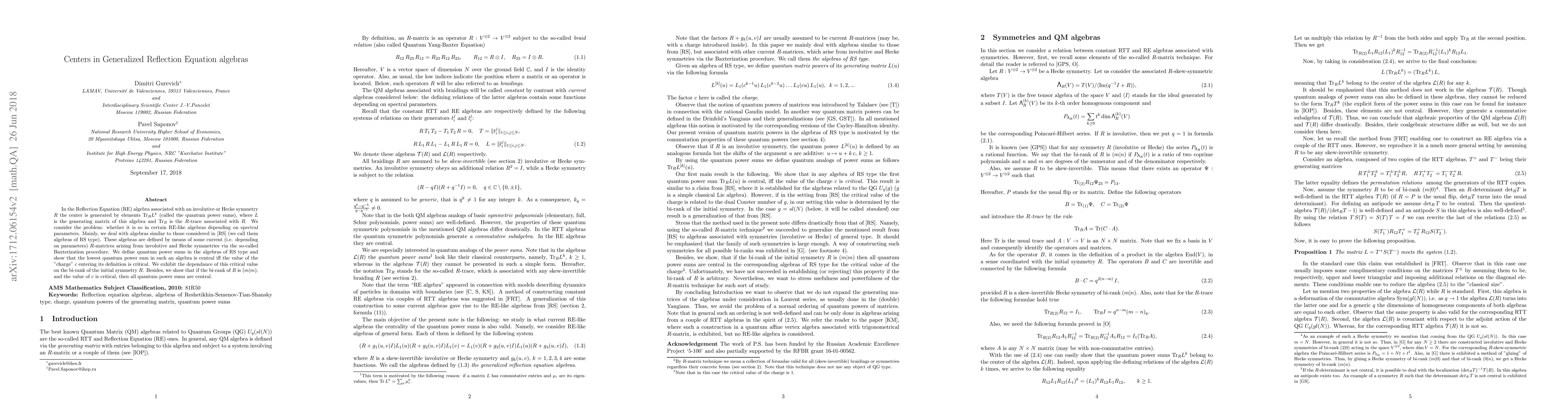 In the Reflection Equation (RE) algebra associated with an involutive or Hecke symmetry $R$ the center is generated by elements ${\rm Tr}_R L^k$ (called the quantum power sums), where $L$ is the generating matrix of this algebra and ${\rm Tr}_R$ is the $R$-trace associated with $R$. We consider the problem: whether it is so in certain RE-like algebras depending on spectral parameters. Mainly, we deal with algebras similar to those considered in \cite{RS} (we call them algebras of RS type). These algebras are defined by means of some current (i.e. depending on parameters) $R$-matrices arising from involutive and Hecke symmetries via the so-called Baxterization procedure. We define quantum power sums in the algebras of RS type and show that the lowest quantum power sum in such an algebra is central iff the value of the "charge" $c$ entering its definition is critical. We exhibit the dependance of this critical value on the bi-rank of the initial symmetry $R$. Besides, we show that if the bi-rank of $R$ is $(m|m)$, and the value of $c$ is critical, then all quantum power sums are central.
