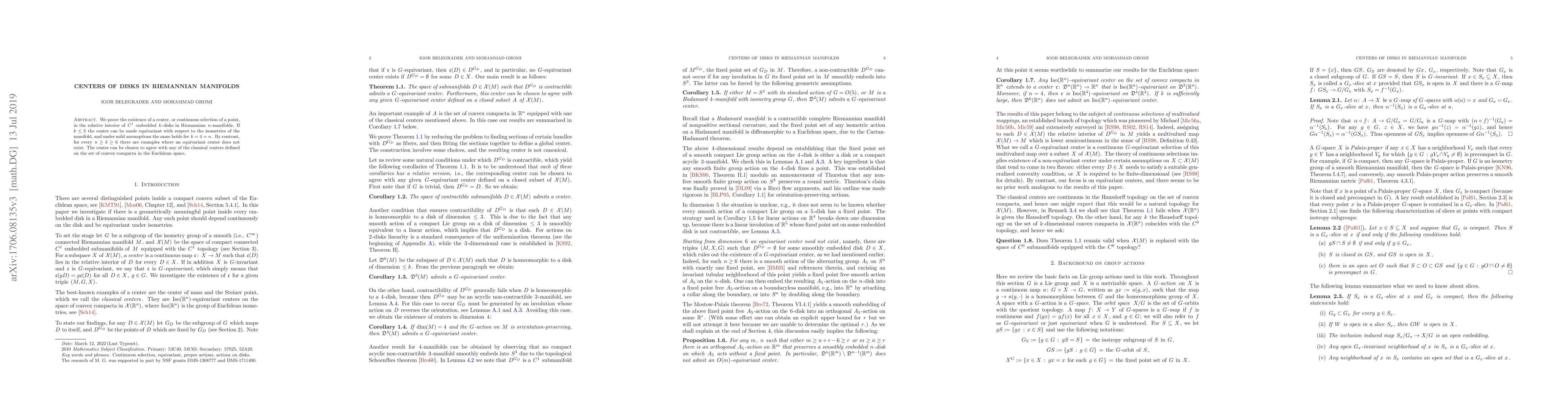 We prove the existence of a center, or continuous selection of a point, in the relative interior of $C^1$ embedded $k$-disks in Riemannian $n$-manifolds. If $k\le 3$ the center can be made equivariant with respect to the isometries of the manifold, and under mild assumptions the same holds for $k=4=n$. By contrast, for every $n\ge k\ge 6$ there are examples where an equivariant center does not exist. The center can be chosen to agree with any of the classical centers defined on the set of convex compacta in the Euclidean space.