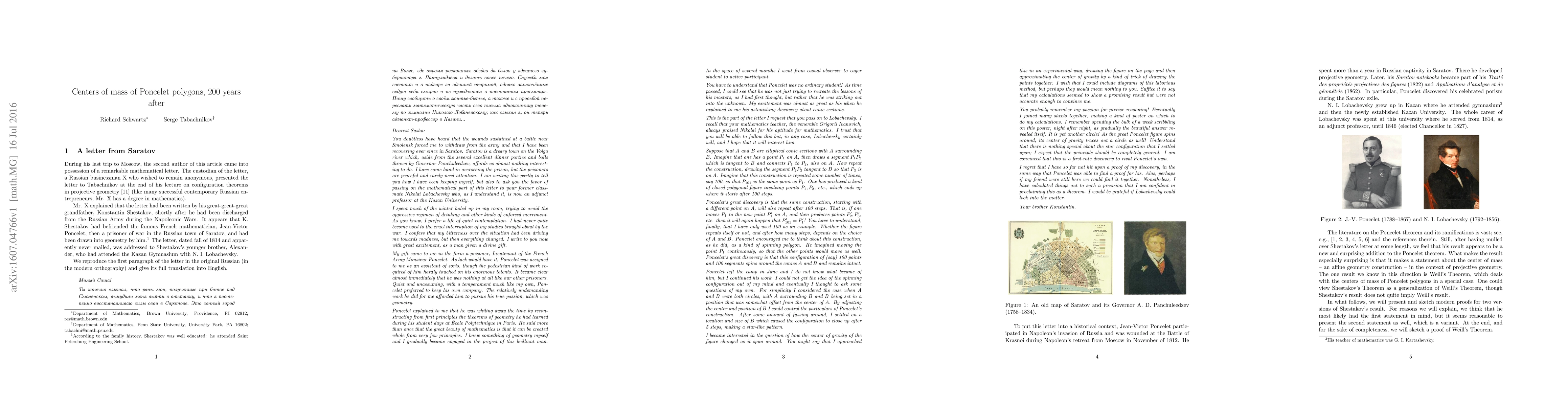 Summary: This paper investigates the centers of mass of Poncelet polygons, finding that their locus forms a conic homothetic to the original conic $\Gamma$ within which they are inscribed. The result holds 200 years after the initial discovery of Poncelet polygons.
