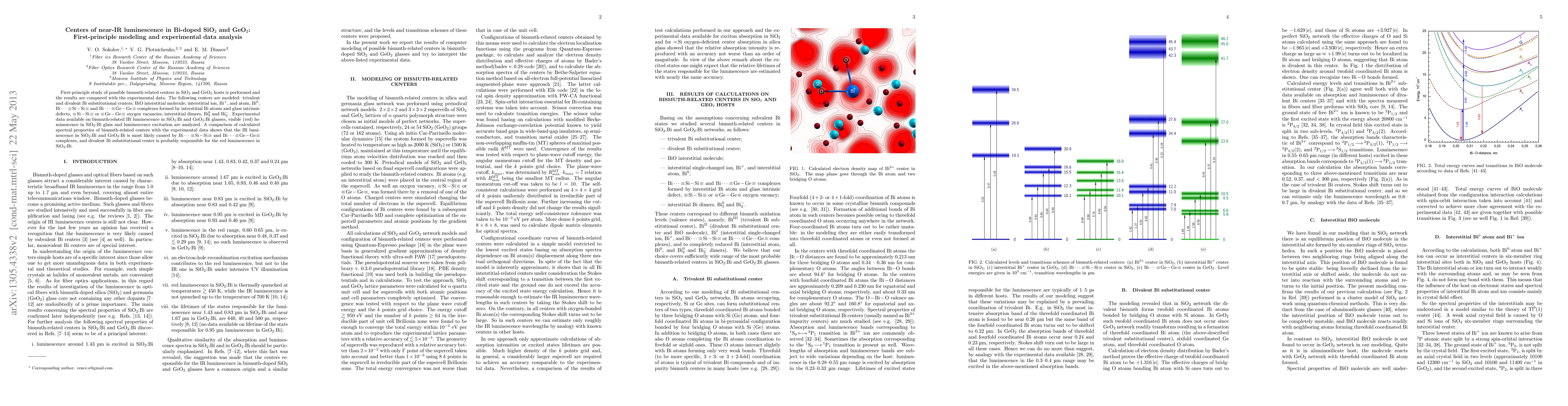 This paper investigates bismuth-related centers in SiO2 and GeO2 using first-principle modeling and compares the results with experimental data. The study identifies Bi...Si-Si and Bi...Ge-Ge complexes as the primary sources of near-IR luminescence, while divalent Bi substitutional centers are linked to red luminescence in SiO2.