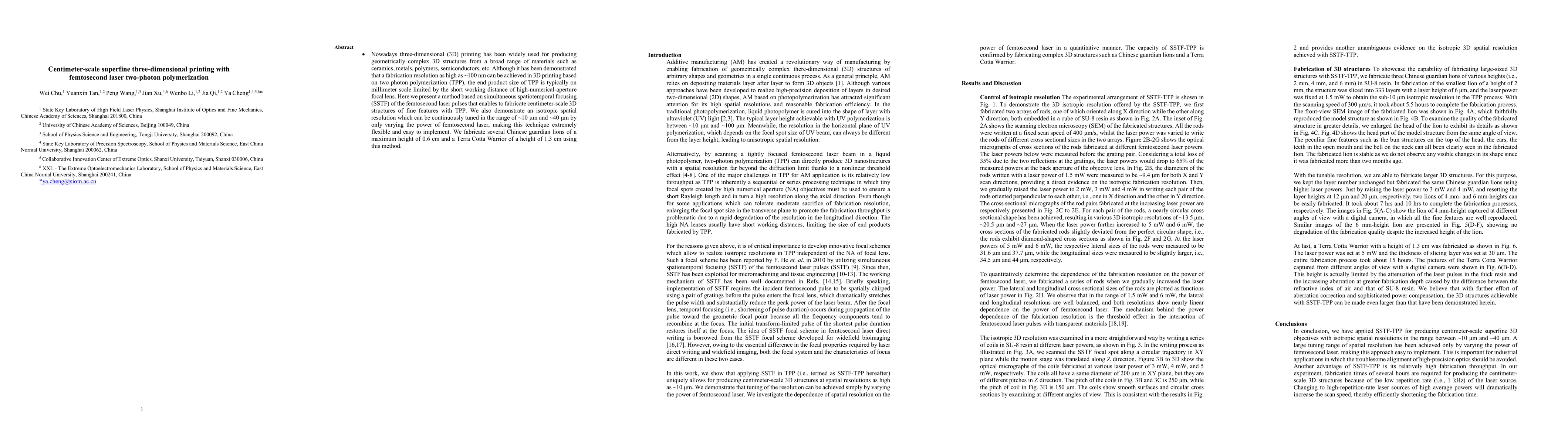 This paper presents a method using femtosecond laser two-photon polymerization with simultaneous spatiotemporal focusing to achieve centimeter-scale 3D printing with tunable isotropic resolution between ~10 µm and ~40 µm, demonstrating the fabrication of detailed Chinese guardian lions and a Terra Cotta Warrior.