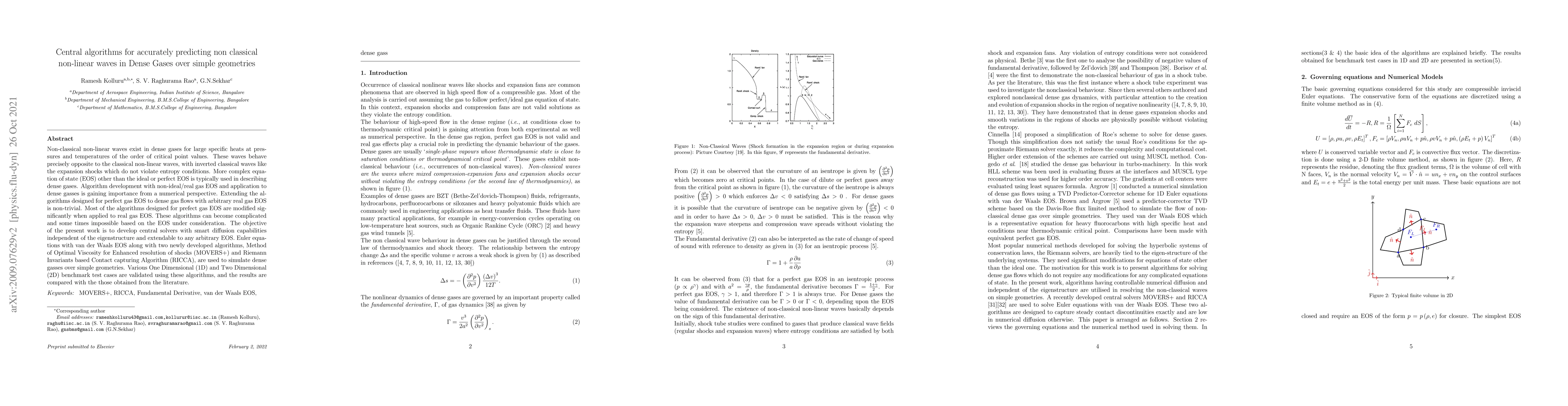 Non-classical non-linear waves exist in dense gases for large specific heats at pressures and temperatures of the order of critical point values. These waves behave precisely opposite to the classical non-linear waves, with inverted classical waves like the expansion shocks which do not violate entropy conditions. More complex equation of state (EOS) other than the ideal or perfect EOS is typically used in describing dense gases. Algorithm development with non-ideal/real gas EOS and application to dense gasses is gaining importance from a numerical perspective. Extending the algorithms designed for perfect gas EOS to dense gas flows with arbitrary real gas EOS is non-trivial. Most of the algorithms designed for prefect gas EOS are modified significantly when applied to real gas EOS. These algorithms can become complicated and some times impossible based on the EOS under consideration. The objective of the present work is to develop central solvers with smart diffusion capabilities independent of the eigenstructure and extendable to any arbitrary EOS. Euler equations with van der Waals EOS along with two newly developed algorithms, Method of Optimal Viscosity for Enhanced resolution of shocks (MOVERS+) and Riemann Invariants based Contact capturing Algorithm (RICCA), are used to simulate dense gasses over simple geometries. Various One Dimensional (1D) and Two Dimensional (2D) benchmark test cases are validated using these algorithms, and the results are compared with the those obtained from the literature.