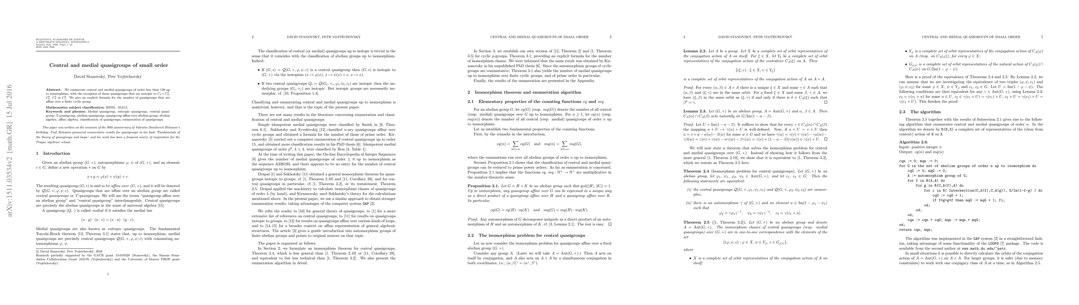 This paper enumerates central and medial quasigroups of order less than 128, excluding those isomorphic to specific cyclic groups, and provides a formula for quasigroups affine over finite cyclic groups. The focus is on classifying and counting these quasigroups up to isomorphism.