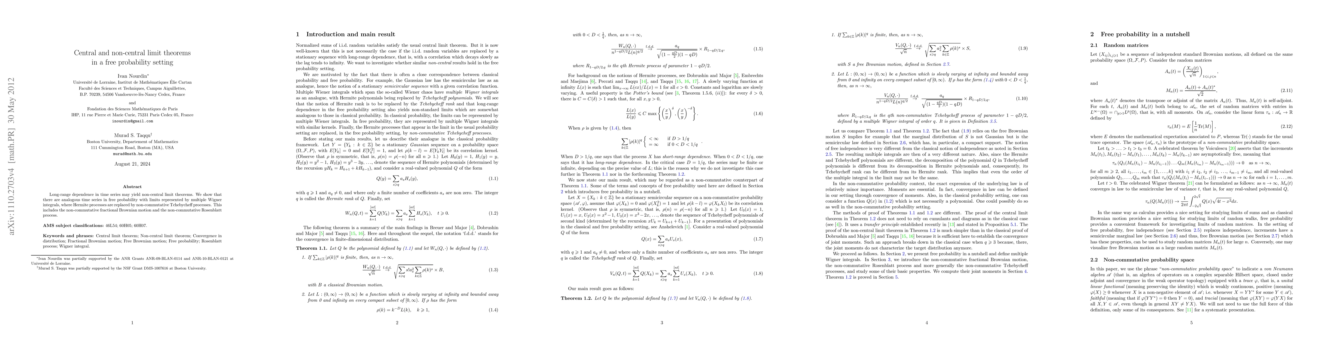 This paper explores central and non-central limit theorems within the framework of free probability, demonstrating that long-range dependence in time series leads to limits represented by multiple Wigner integrals, with non-commutative Tchebycheff processes replacing Hermite processes, including non-commutative fractional Brownian motion and the Rosenblatt process.