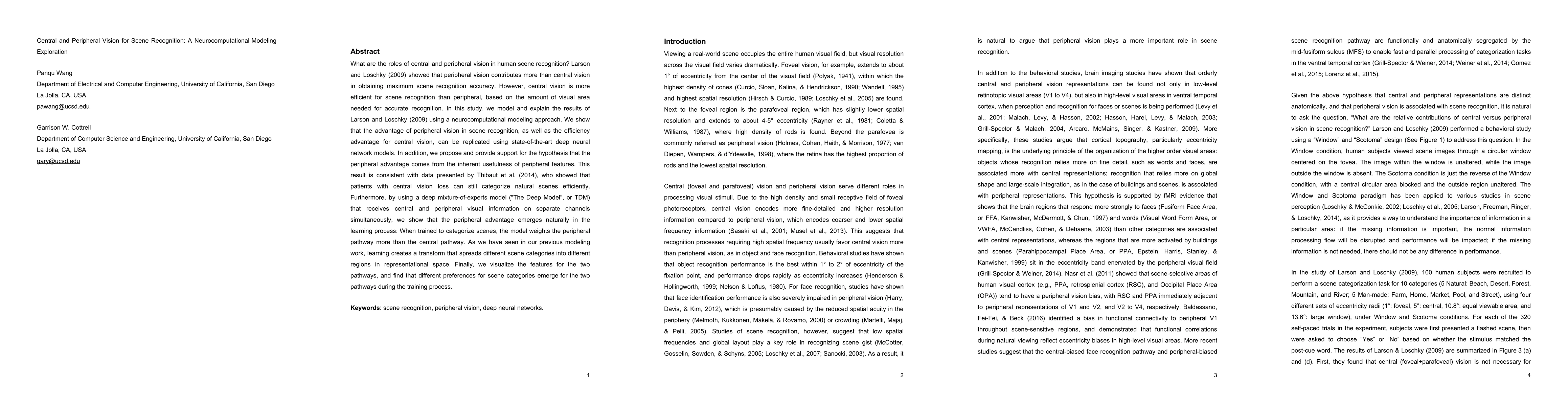 This study uses neurocomputational modeling to explore the roles of central and peripheral vision in scene recognition, showing that peripheral vision contributes more to accuracy but is less efficient than central vision. The research replicates these findings using deep neural networks, supporting the hypothesis that peripheral vision's advantage arises from the inherent usefulness of peripheral features, and demonstrates that a deep mixture-of-experts model naturally weights the peripheral pathway more heavily during training.