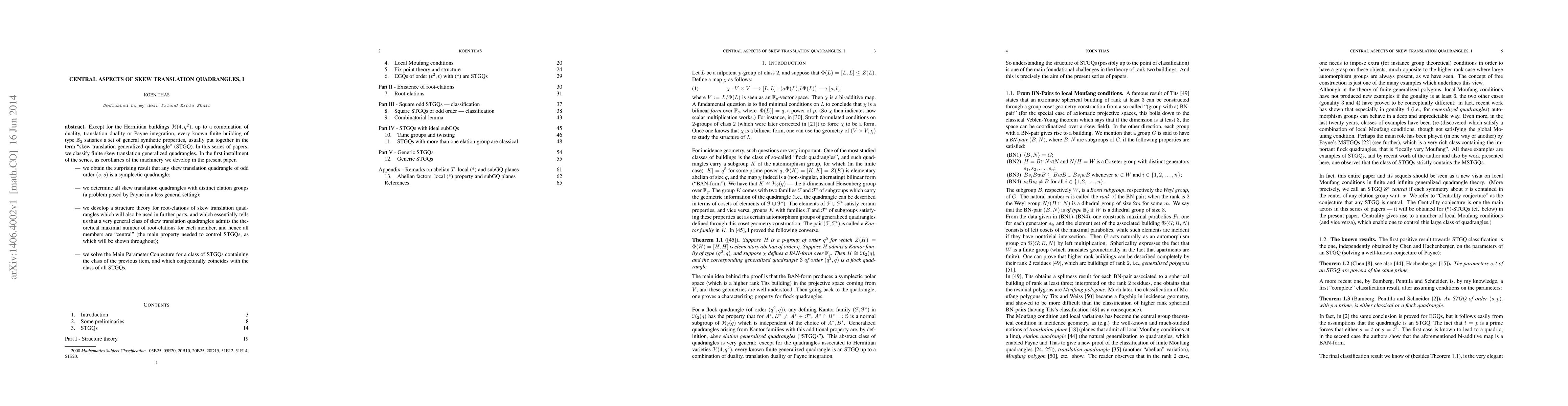 Except for the Hermitian buildings $\mathcal{H}(4,q^2)$, up to a combination of duality, translation duality or Payne integration, every known finite building of type $\mathbb{B}_2$ satisfies a set of general synthetic properties, usually put together in the term "skew translation generalized quadrangle" (STGQ). In this series of papers, we classify finite skew translation generalized quadrangles. In the first installment of the series, as corollaries of the machinery we develop in the present paper, (a) we obtain the surprising result that any skew translation quadrangle of odd order $(s,s)$ is a symplectic quadrangle; (b) we determine all skew translation quadrangles with distinct elation groups (a problem posed by Payne in a less general setting); (c) we develop a structure theory for root-elations of skew translation quadrangles which will also be used in further parts, and which essentially tells us that a very general class of skew translation quadrangles admits the theoretical maximal number of root-elations for each member, and hence all members are "central" (the main property needed to control STGQs, as which will be shown throughout); (d) we solve the Main Parameter Conjecture for a class of STGQs containing the class of the previous item, and which conjecturally coincides with the class of all STGQs.
