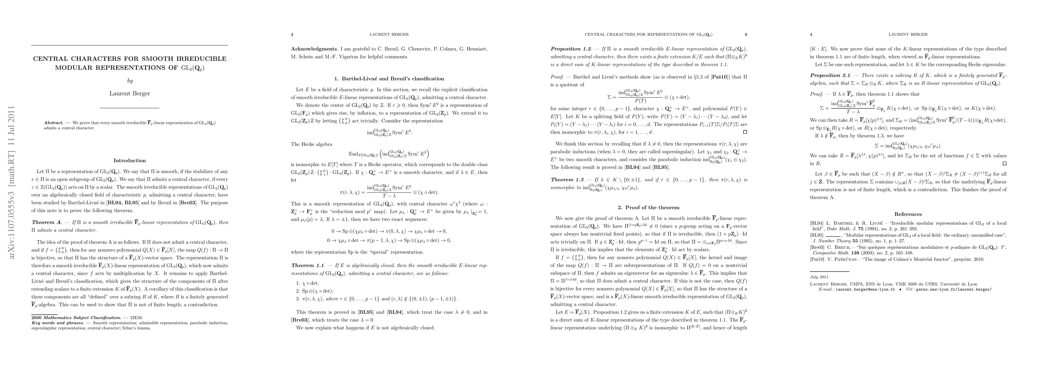 Researchers prove that every smooth irreducible representation of GL_2(Q_p) has a central character, which has implications for understanding algebraic representations in number theory.