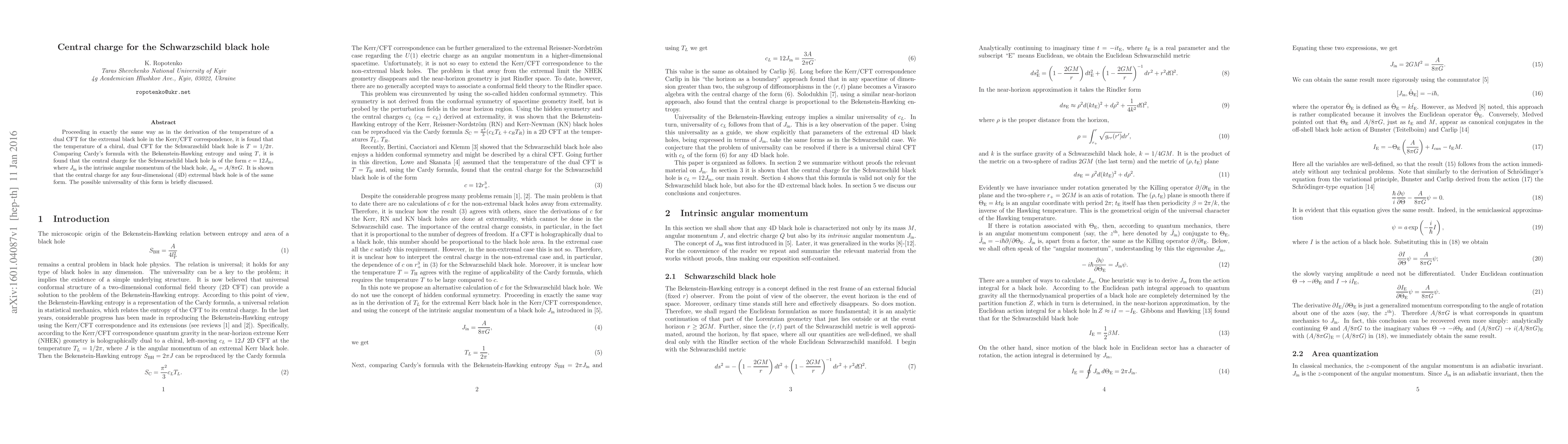 Proceeding in exactly the same way as in the derivation of the temperature of a dual CFT for the extremal black hole in the Kerr/CFT correspondence, it is found that the temperature of a chiral, dual CFT for the Schwarzschild black hole is $T=1/2\pi$. Comparing Cardy's formula with the Bekenstein-Hawking entropy and using $T$, it is found that the central charge for the Schwarzschild black hole is of the form $c=12J_{\rm in}$, where $J_{\rm in}$ is the intrinsic angular momentum of the black hole, $J_{\rm in}=A/8\pi G$. It is shown that the central charge for any four-dimensional (4D) extremal black hole is of the same form. The possible universality of this form is briefly discussed.