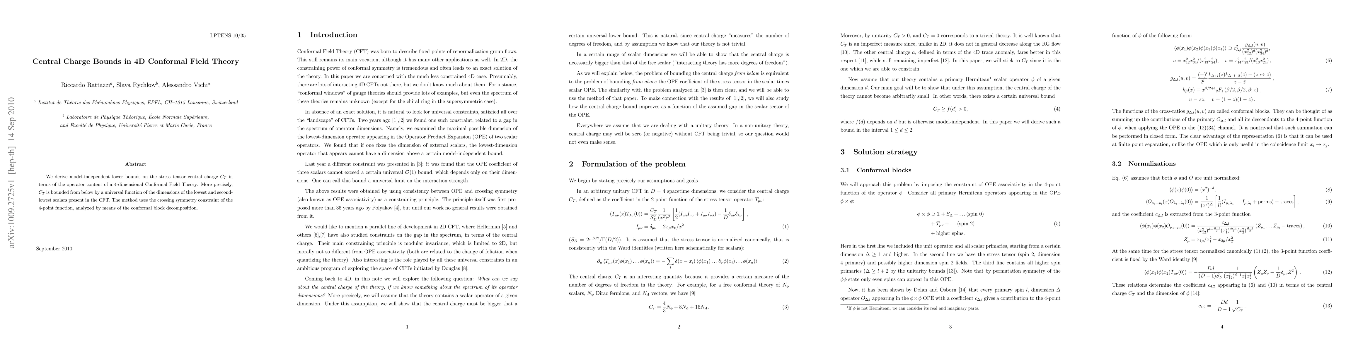 This paper establishes model-independent lower bounds for the stress tensor central charge C_T in 4D Conformal Field Theory, showing it is bounded by a function of the dimensions of the lowest and second-lowest scalars, using crossing symmetry and conformal block decomposition.