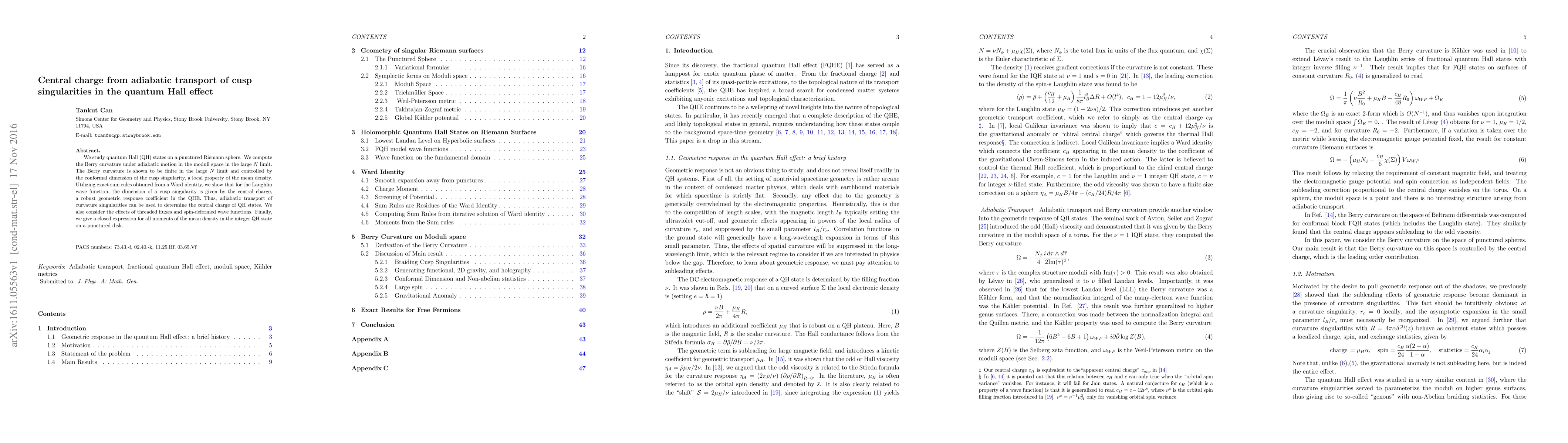 We study quantum Hall (QH) states on a punctured Riemann sphere. We compute the Berry curvature under adiabatic motion in the moduli space in the large N limit. The Berry curvature is shown to be finite in the large N limit and controlled by the conformal dimension of the cusp singularity, a local property of the mean density. Utilizing exact sum rules obtained from a Ward identity, we show that for the Laughlin wave function, the dimension of a cusp singularity is given by the central charge, a robust geometric response coefficient in the QHE. Thus, adiabatic transport of curvature singularities can be used to determine the central charge of QH states. We also consider the effects of threaded fluxes and spin-deformed wave functions. Finally, we give a closed expression for all moments of the mean density in the integer QH state on a punctured disk.