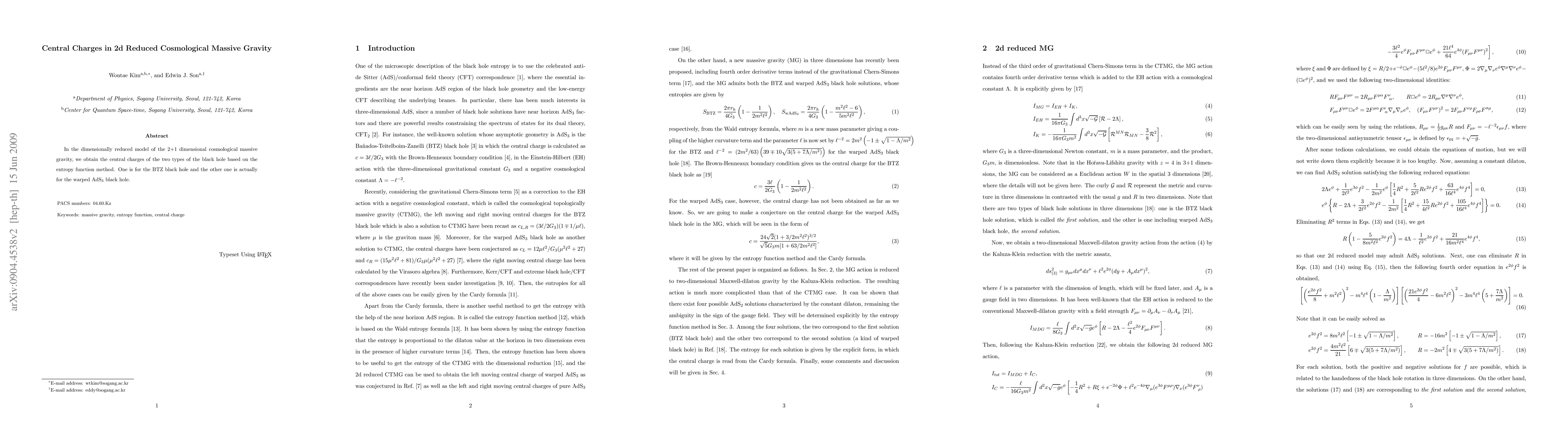 In the dimensionally reduced model of the 2+1 dimensional cosmological massive gravity, we obtain the central charges of the two types of the black hole based on the entropy function method. One is for the BTZ black hole and the other one is actually for the warped AdS$_3$ black hole.
