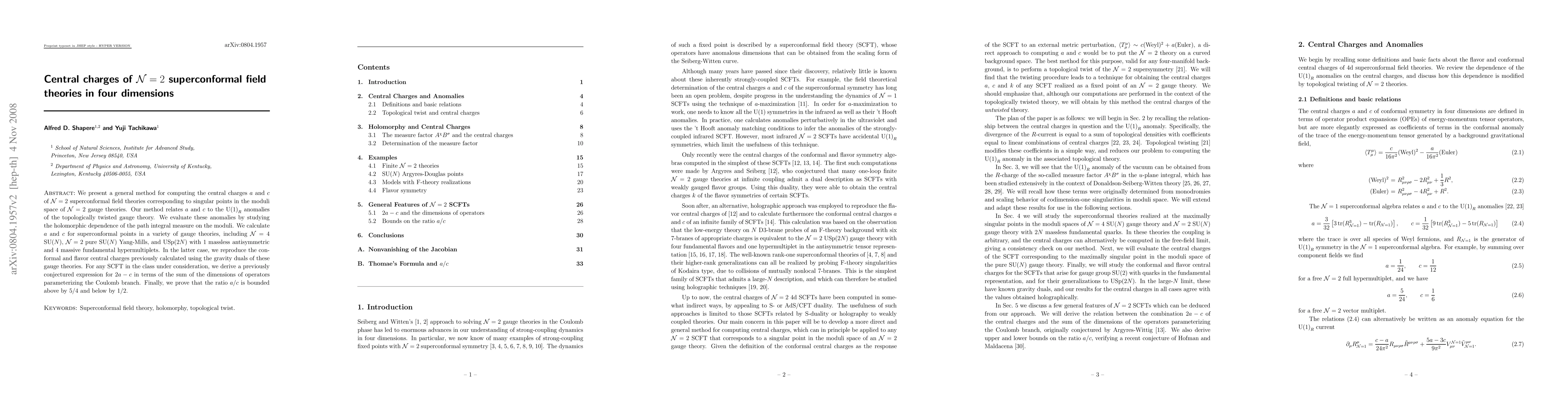 We present a general method for computing the central charges a and c of N=2 superconformal field theories corresponding to singular points in the moduli space of N=2 gauge theories. Our method relates a and c to the U(1)_R anomalies of the topologically twisted gauge theory. We evaluate these anomalies by studying the holomorphic dependence of the path integral measure on the moduli. We calculate a and c for superconformal points in a variety of gauge theories, including N=4 SU(N), N=2 pure SU(N) Yang-Mills, and USp(2N) with 1 massless antisymmetric and 4 massive fundamental hypermultiplets. In the latter case, we reproduce the conformal and flavor central charges previously calculated using the gravity duals of these gauge theories. For any SCFT in the class under consideration, we derive a previously conjectured expression for 2a-c in terms of the sum of the dimensions of operators parameterizing the Coulomb branch. Finally, we prove that the ratio a/c is bounded above by 5/4 and below by 1/2.