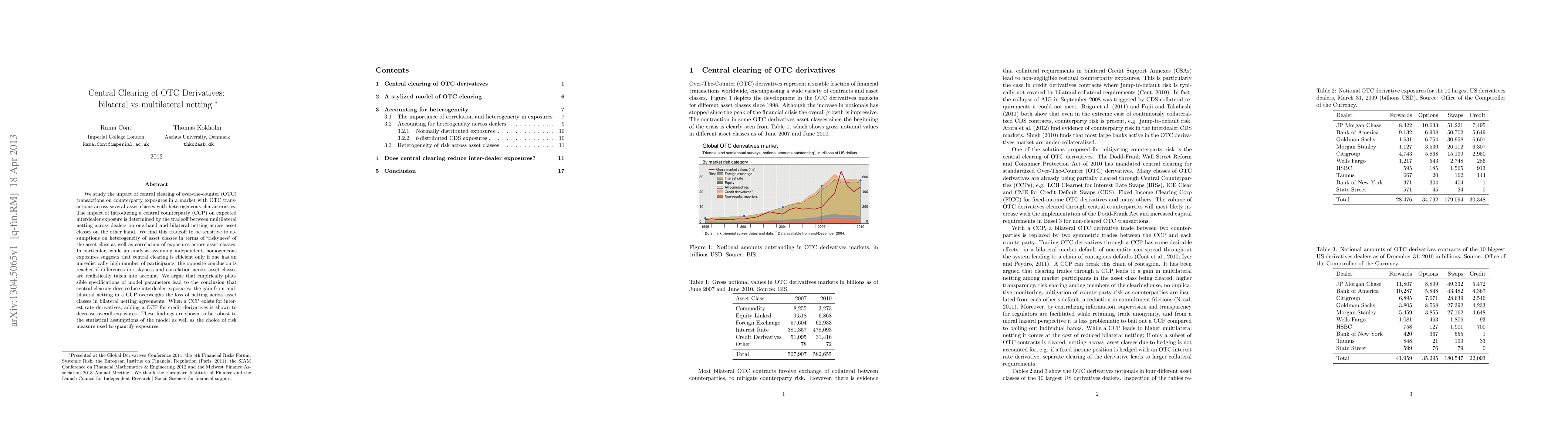 This paper examines the impact of central clearing of OTC derivatives, comparing multilateral and bilateral netting. It finds that central clearing reduces interdealer exposures, especially when considering realistic heterogeneity and correlations across asset classes, thus demonstrating the benefits of multilateral netting in central counterparties.