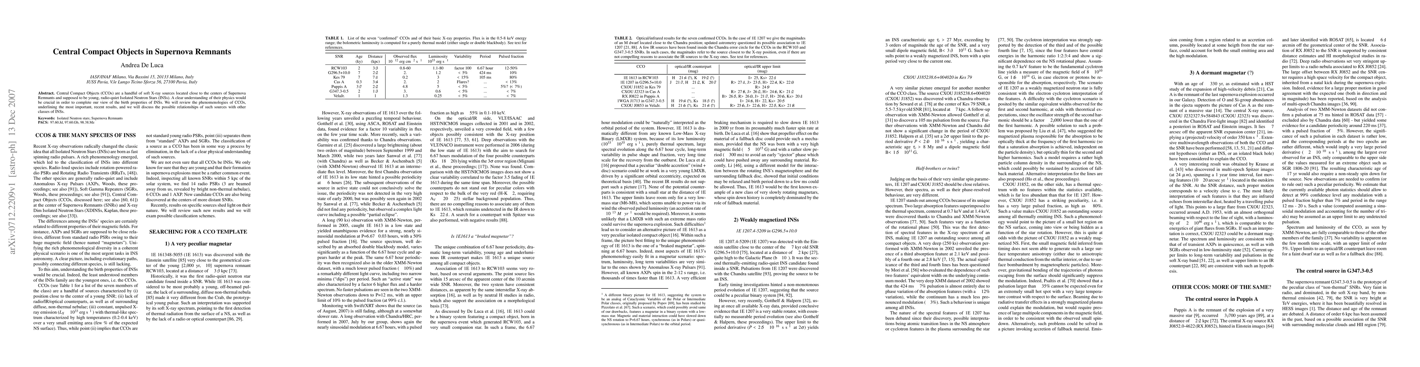 Central Compact Objects (CCOs) are a handful of soft X-ray sources located close to the centers of Supernova Remnants and supposed to be young, radio-quiet Isolated Neutron Stars (INSs). A clear understanding of their physics would be crucial in order to complete our view of the birth properties of INSs. We will review the phenomenologies of CCOs, underlining the most important, recent results, and we will discuss the possible relationships of such sources with other classes of INSs.