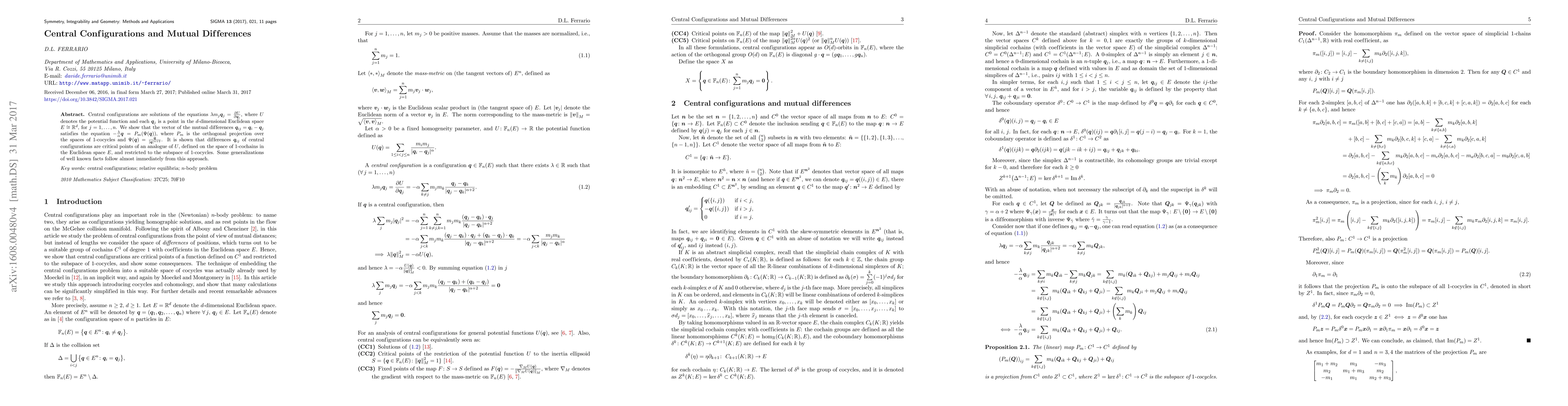 Central configurations are solutions of the equations $\lambda m_j\boldsymbol{q}_j = \frac{\partial U}{\partial \boldsymbol{q}_j}$, where $U$ denotes the potential function and each $\boldsymbol{q}_j$ is a point in the $d$-dimensional Euclidean space $E\cong {\mathbb R}^d$, for $j=1,\ldots, n$. We show that the vector of the mutual differences $\boldsymbol{q}_{ij} = \boldsymbol{q}_i - \boldsymbol{q}_j$ satisfies the equation $-\frac{\lambda}{\alpha} \boldsymbol{q} = P_m(\Psi(\boldsymbol{q}))$, where $P_m$ is the orthogonal projection over the spaces of $1$-cocycles and $\Psi(\boldsymbol{q}) = \frac{\boldsymbol{q}}{|\boldsymbol{q}|^{\alpha+2}}$. It is shown that differences $\boldsymbol{q}_{ij}$ of central configurations are critical points of an analogue of $U$, defined on the space of $1$-cochains in the Euclidean space $E$, and restricted to the subspace of $1$-cocycles. Some generalizations of well known facts follow almost immediately from this approach.