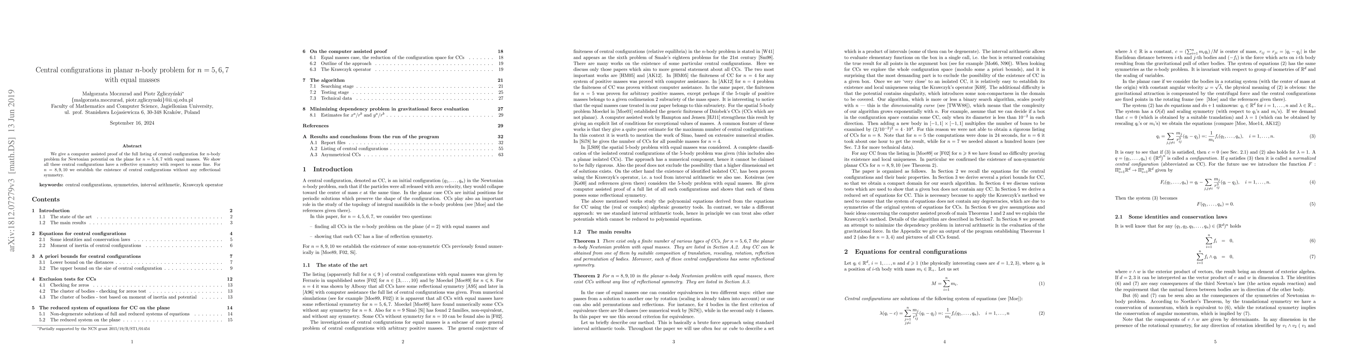 This paper presents a computer-assisted proof identifying all central configurations for the planar $n$-body problem with equal masses for $n=5,6,7$, showing they all exhibit reflective symmetry. It also establishes the existence of central configurations for $n=8,9,10$ that lack such symmetry.