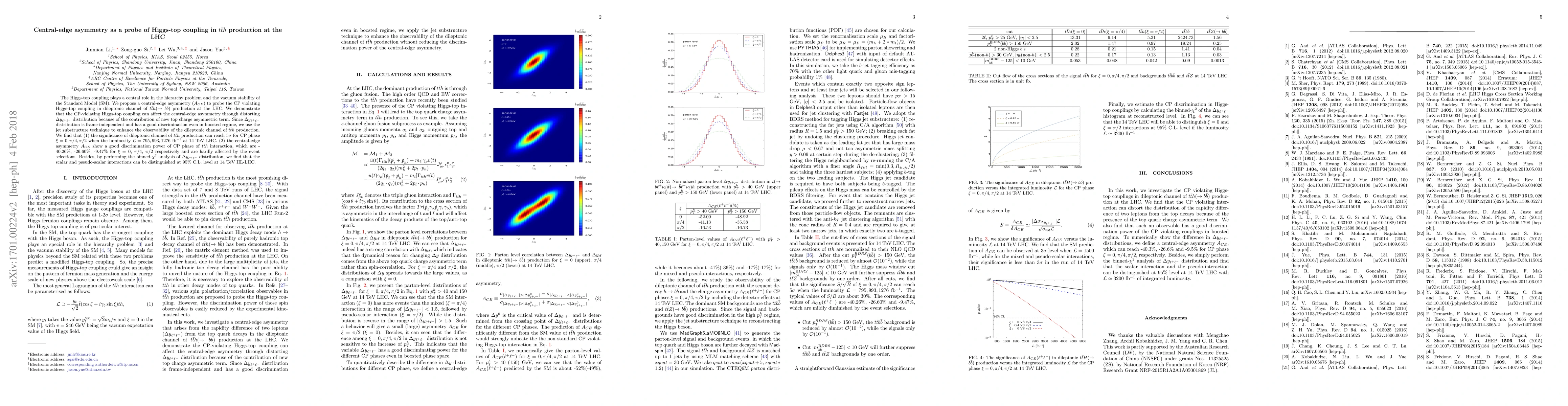 The Higgs-top coupling plays a central role in the hierarchy problem and the vacuum stability of the Standard Model (SM). We propose a central-edge asymmetry ($A_{CE}$) to probe the CP violating Higgs-top coupling in dileptonic channel of $t\bar{t}h(\to b\bar{b})$ production at the LHC. We demonstrate that the CP-violating Higgs-top coupling can affect the central-edge asymmetry through distorting $\Delta y_{\ell^+\ell^-}$ distribution because of the contribution of new top charge asymmetric term. Since $\Delta y_{\ell^+\ell^-}$ distribution is frame-independent and has a good discrimination even in boosted regime, we use the jet substructure technique to enhance the observability of the dileptonic channel of $t\bar{t}h$ production. We find that (1) the significance of dileptonic channel of $t\bar{t}h$ production can reach $5\sigma$ for CP phase $\xi=0,\pi/4,\pi/2$ when the luminosity ${\cal L}=795,993,1276$ fb$^{-1}$ at 14 TeV LHC. (2) the central-edge asymmetry $A_{CE}$ show a good discrimination power of CP phase of $t\bar{t}h$ interaction, which are -40.26\%, -26.60\%, -9.47\% for $\xi=0$, $\pi/4$, $ \pi/2$ respectively and are hardly affected by the event selections. Besides, by performing the binned-$\chi^2$ analysis of $\Delta y_{\ell^+\ell^-}$ distribution, we find that the scalar and pseudo-scalar interactions can be distinguished at 95\% C.L. level at 14 TeV HL-LHC.
