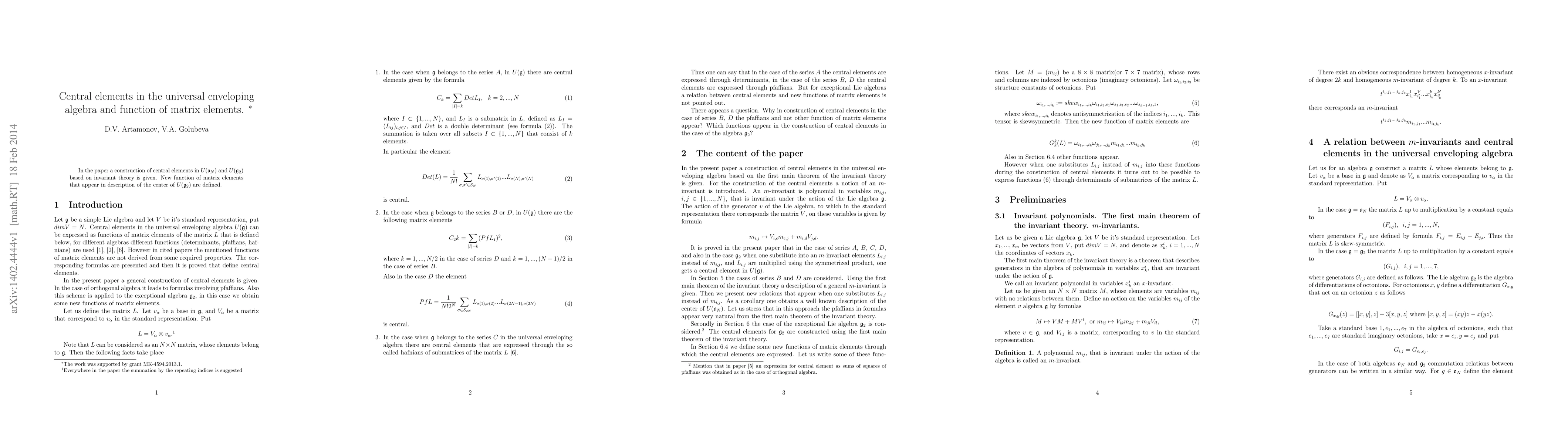 In the paper a construction of central elements in $U(\mathfrak{o}_N)$ and $U(\mathfrak{g}_2)$ based on invariant theory is given. New function of matrix elements that appear in description of the center of $U(\mathfrak{g}_2)$ are defined.