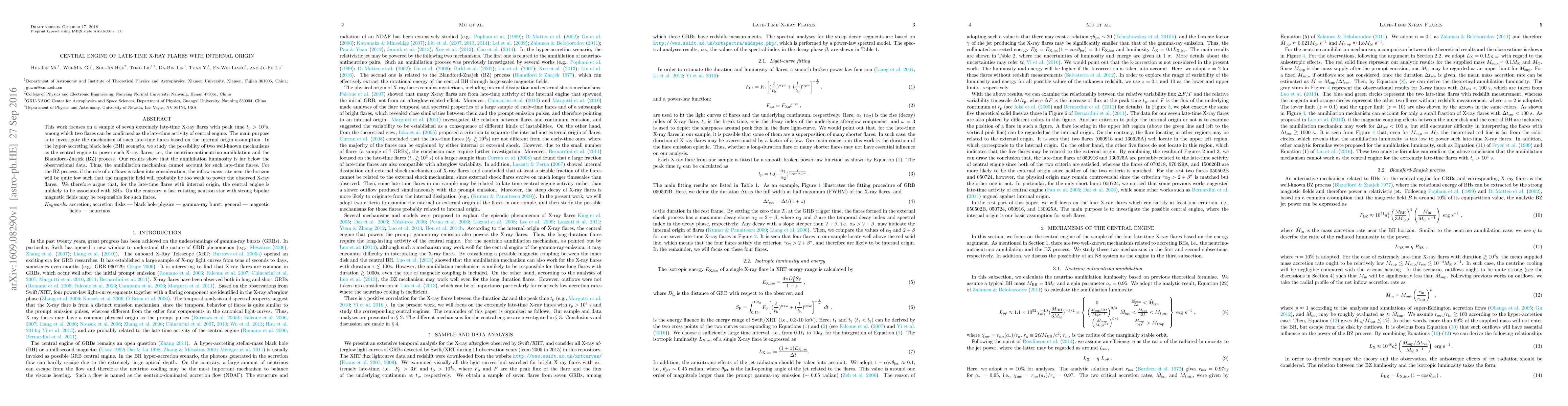 The paper presents a detailed analysis of two central engine mechanisms for late-time X-ray flares, ruling out neutrino-antineutrino annihilation and questioning the BZ process under typical conditions.