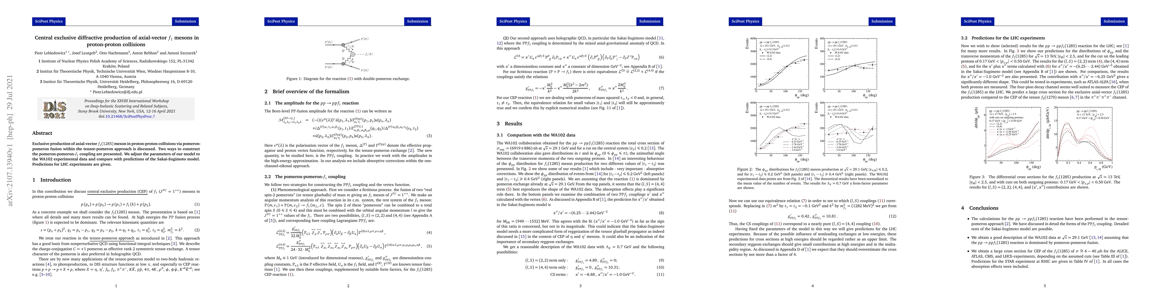 This paper discusses the exclusive production of the axial-vector $f_{1}(1285)$ meson in proton-proton collisions through pomeron-pomeron fusion using the tensor-pomeron approach. The model parameters are fitted to WA102 experimental data and compared with the Sakai-Sugimoto model, with predictions provided for future LHC experiments.