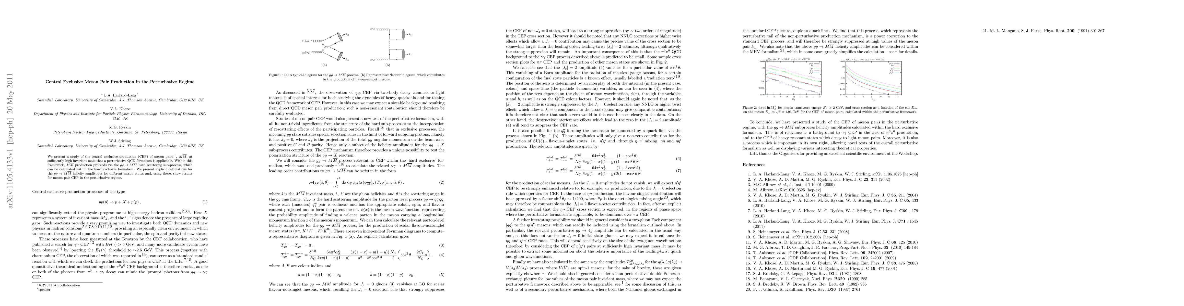 We present a study of the central exclusive production (CEP) of meson pairs, MMbar, at sufficiently high invariant mass that a perturbative QCD formalism is applicable. Within this framework, MMbar production proceeds via the gg --> MMbar hard scattering sub-process, which can be calculated within the hard exclusive formalism. We present explicit calculations for the gg --> MMbar helicity amplitudes for different meson states and, using these, show results for meson pair CEP in the perturbative regime.