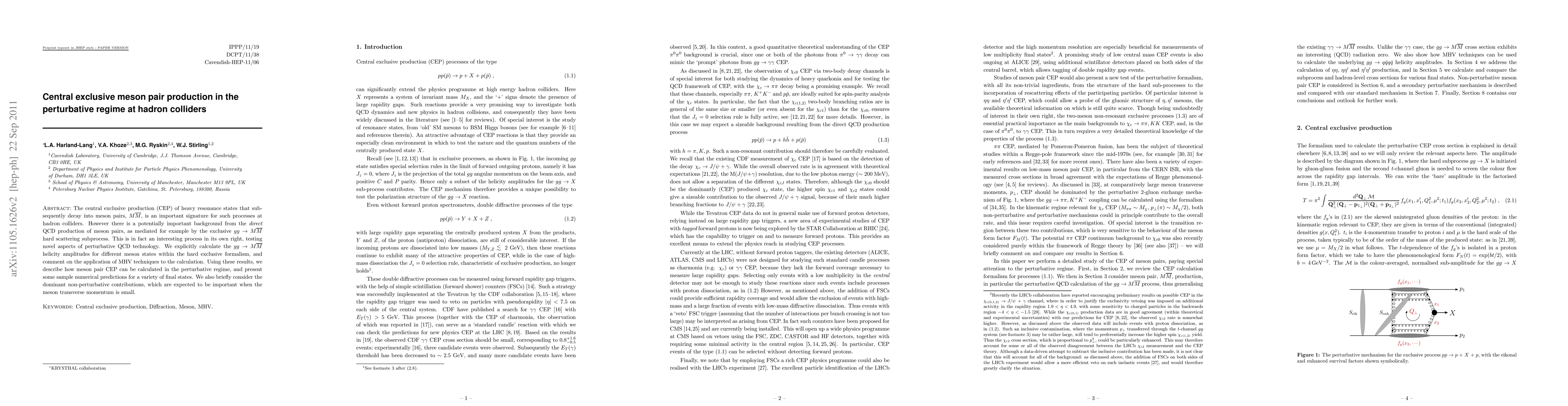 This paper investigates the central exclusive production of heavy resonance states decaying into meson pairs at hadron colliders, focusing on the perturbative QCD process of exclusive gg --> MMbar. It calculates the gg --> MMbar helicity amplitudes and discusses the application of MHV techniques, providing numerical predictions for various final states and considering non-perturbative contributions for low meson transverse momentum.