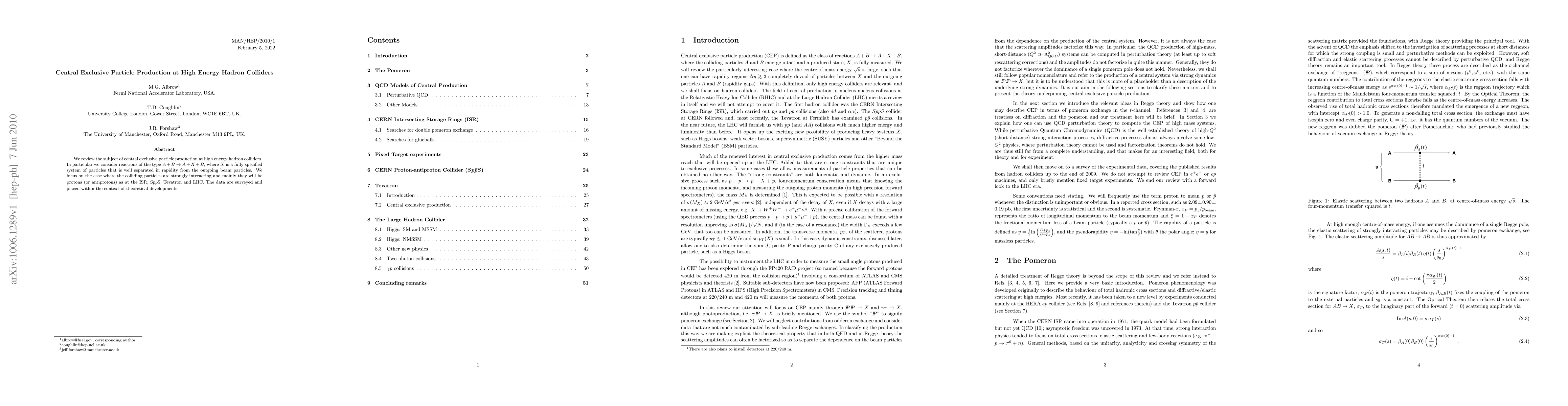 We review the subject of central exclusive particle production at high energy hadron colliders. In particular we consider reactions of the type A + B -> A + X + B, where X is a fully specified system of particles that is well separated in rapidity from the outgoing beam particles. We focus on the case where the colliding particles are strongly interacting and mainly they will be protons (or antiprotons) as at the ISR, SppS, Tevatron and LHC. The data are surveyed and placed within the context of theoretical developments.