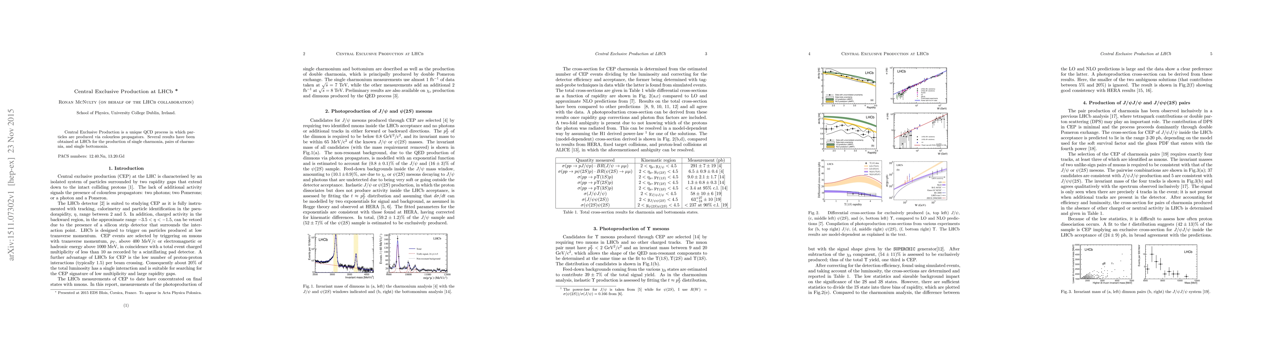 Summary: This paper discusses Central Exclusive Production at LHCb, focusing on QCD processes involving colourless propagators, and reports findings on the production of single charmonia, charmonium pairs, and single bottomonia.