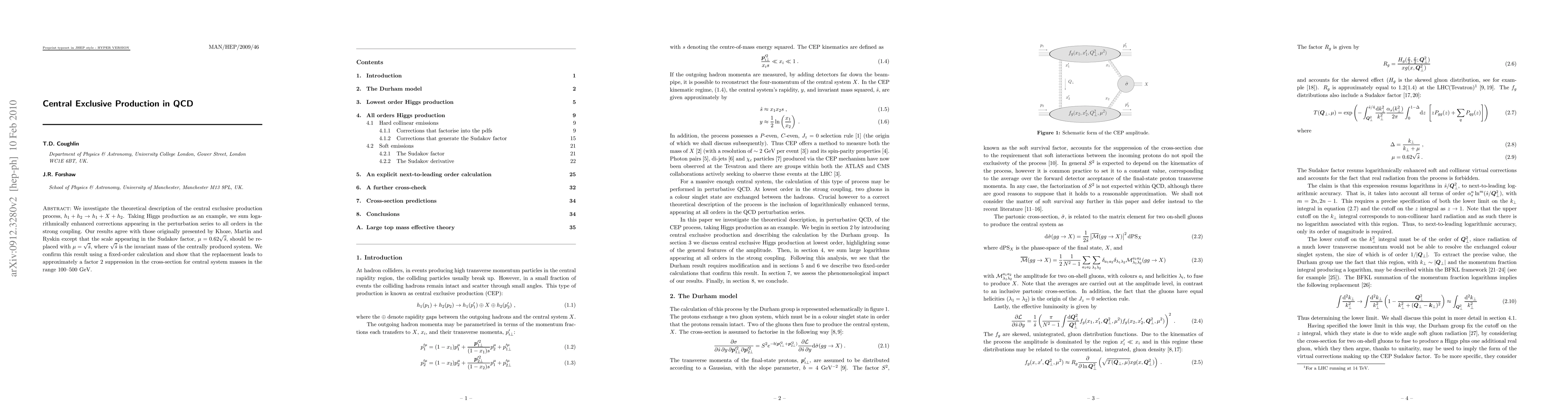 We investigate the theoretical description of the central exclusive production process, h1+h2 -> h1+X+h2. Taking Higgs production as an example, we sum logarithmically enhanced corrections appearing in the perturbation series to all orders in the strong coupling. Our results agree with those originally presented by Khoze, Martin and Ryskin except that the scale appearing in the Sudakov factor, mu=0.62 \sqrt{\hat{s}}, should be replaced with mu=\sqrt{\hat{s}}, where \sqrt{\hat{s}} is the invariant mass of the centrally produced system. We confirm this result using a fixed-order calculation and show that the replacement leads to approximately a factor 2 suppression in the cross-section for central system masses in the range 100-500 GeV.