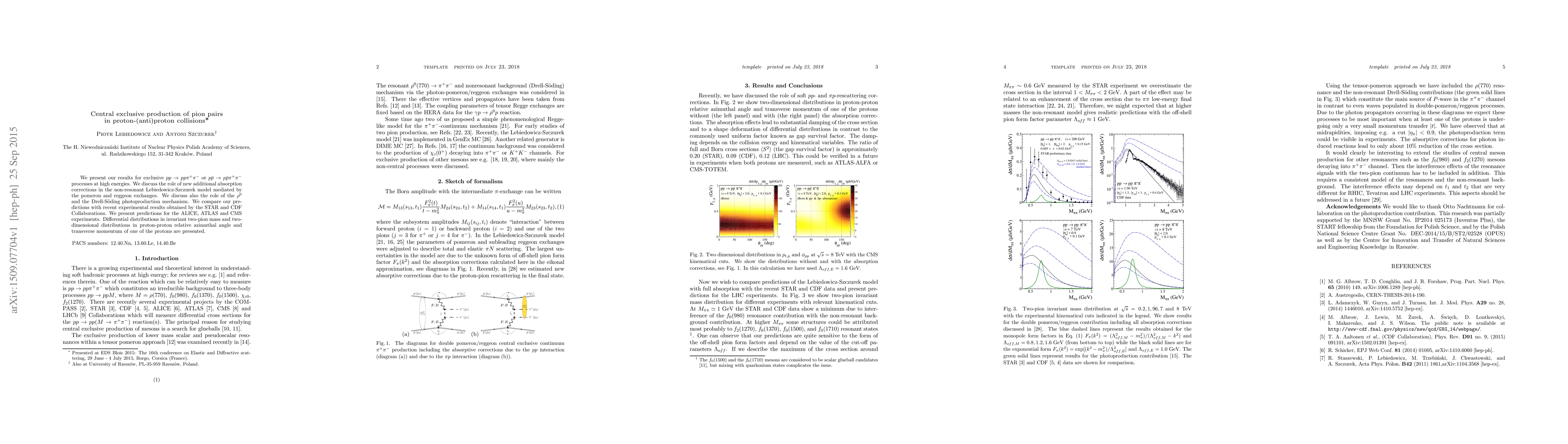 This paper investigates exclusive central production of pion pairs in high-energy proton-(anti)proton collisions, focusing on the Lebiedowicz-Szczurek model with new absorption corrections and the role of $\rho^{0}$ mesons and Drell-S\"oding mechanism. Predictions are compared with recent STAR and CDF experimental results and presented for future ALICE, ATLAS, and CMS experiments.