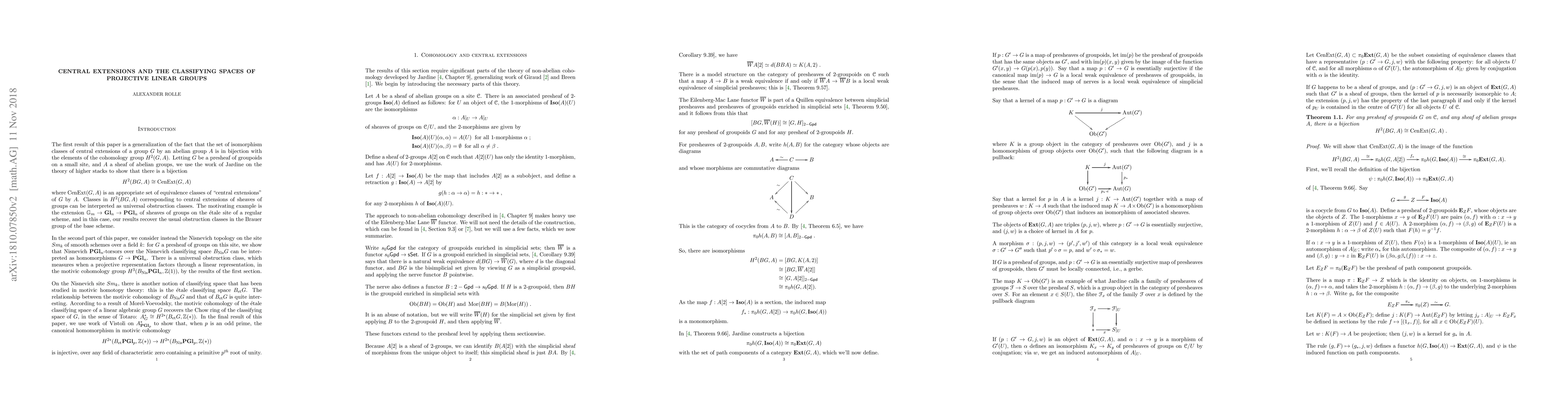 If $G$ is a presheaf of groupoids on a small site, and $A$ is a sheaf of abelian groups, we prove that the sheaf cohomology group $H^2 (BG, A)$ is in bijection with a set of central extensions of $G$ by $A$. We use this result to study the motivic cohomology of the Nisnevich classifying space $BG$, when $G$ is a presheaf of groups on the smooth Nisnevich site over a field, and particularly when $G = PGL_{n}$. Finally, we show that, when $p$ is an odd prime, the Chow ring of the classifying space of $PGL_{p}$ injects into the motivic cohomology of the Nisnevich classifying space $BPGL_{p}$, over any field of characteristic zero containing a primitive $p^{th}$ root of unity.
