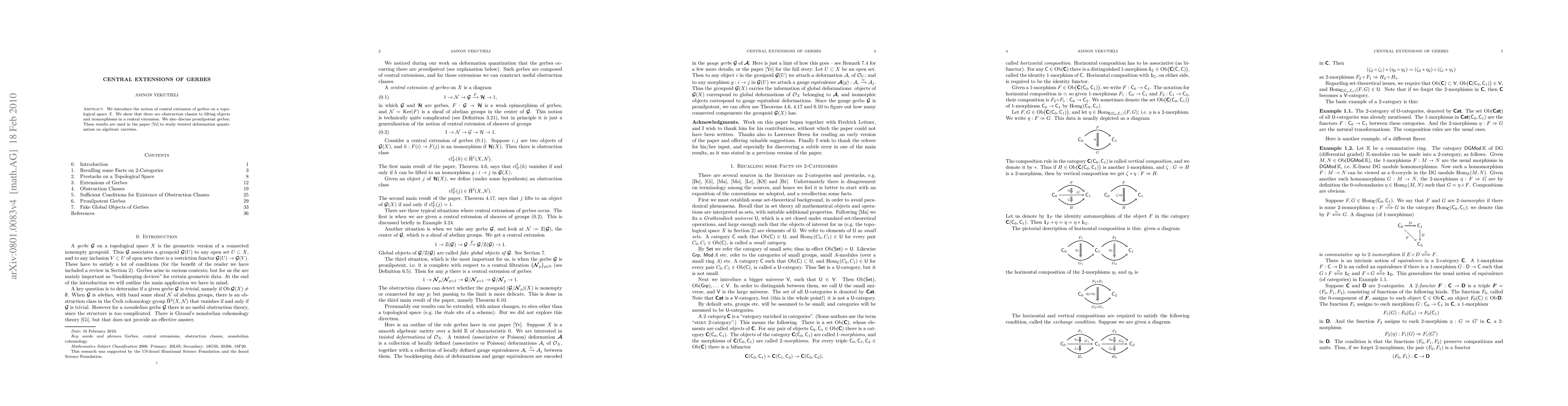 This paper introduces central extensions of gerbes on topological spaces, demonstrating obstruction classes for lifting objects and isomorphisms. It also explores pronilpotent gerbes, laying foundational results for subsequent studies on twisted deformation quantization on algebraic varieties.